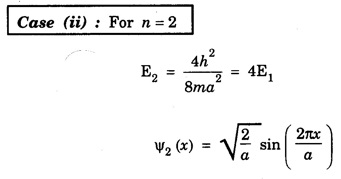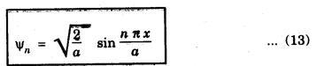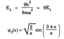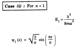 NORMALISATION OF WAVE FUNCTION The constant A is determined by normalisation of wave function as follows. It is certain that the particle is some where inside the box. Thus, the probability of finding the particle inside the box of length a is given by The second term of the integral becomes zero at both limits On substituting. eqn (12) in egn (9), we have The eigen function (Ψn) belongs to eigen energy values En and it is expressed as This expression (13) is known as normalised eigen function. The energy En and normalised wave functions Ψn are shown in .fig. 6.10. Special cases From eqns (8) and (13), the following cases can be taken and they explain the motion of electron in one dimensional box. Hence, Ψ1 (x) is maximum at exactly middle of the box as shown in fig. 6.10. Hence, Ψ2 (x) is maximum at quarter distance from either sides of the box as shown in 6.10. Hence, Ψ3 (x) is maximum at exactly middle and one-sixth distance from either sides of the box as shown in fig. 6.10.