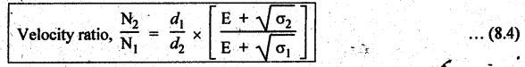 PHENOMENON OF CREEP IN BELTS • Presence of friction between pulley and belt causes differential tension in the belt. This differential tension causes the belt to elongate or contract and create a relative motion between the belt, and the pulley surface. This relative motion between the belt and the pulley surface is created due to the phenomenon known as elastic creep. • We know that the tension on the tight side of a belt drive is more than the tension on the slack side. As a result of this, the belt is stretched more on the tight side as compared to the slack side. Therefore, the driver pulley receives more length of the belt and delivers less. Hence, the belt creeps (jumps) forward. On the other hand, the driven pulley receives a shorter length of the belt and delivers more. Thus the belt creeps (jumps) backward. This phenomenon is called creeping of belt. • Definition: The creep may be defined as the relative motion between the belt and the pulley surface due to unequal stretching of the two sides of the drive. • Effect: The effect of creep is to reduce the speed of the driven pulley and consequently the power transmitted. Let σ1 = Stress in the belt on the tight side, σ2 = Stress in the belt on the slack side, and E = Young's modulus of the belt material. Velocity ratio, considering creep, is given by Note In practice the combined effect of slip and creep is called simply slip and the combined effect should not exceed three percent.1. Effect of Creep on Velocity Ratio