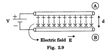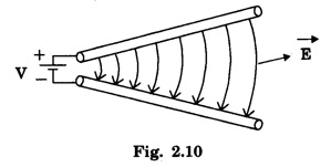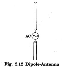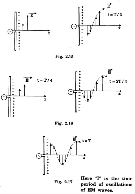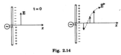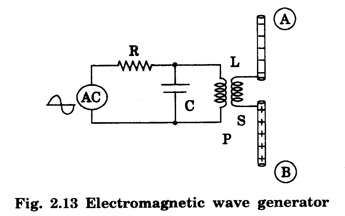 PRODUCING ELECTROMAGNETIC WAVES It follows from Maxwell's equations that electromagnetic radiation occurs whenever electric charge accelerates. Let us consider a capacitor like arrangement as shown in fig. 2.9. Here, A and B are two conducting rods. They are separated by a distance ‘d'. If a voltage source is connected across these rods or wires, a corresponding electric field occurs between the rods. If the two rods get tilted in the following manner, correspondingly the electric field pattern also changes (Fig. 2.10). Further if the two rods (or) wires are tilted in the following manner then, the electric field lines are also changed (Fig. 2.11). Now by replacing the voltage source as a AC voltage source as shown in fig. 2.12, then this arrangement is called as dipole - antenna. A basic design of a electromagnetic wave generator involves this dipole - antenna arrangement. A diagram of one such arrangement is shown in fig. 2.13. In the figure 2.13, thé AC voltage source with a particular frequency ‘f’ is fed to a LCR circuit. The inductor 'L' is a transformer. The secondary of the transformer is attached to the two conducting rods (A) and (B) as shown in the fig. 2.13. As the voltage of the AC source oscillates the electric potentials of the two wires (A) and (B) also oscillate. Due to acceleration of charges, the current flowing through the rod is alternating or it periodically changes its direction. So the electrons in the rods are constantly accelerated and deaccelerated when the direction of the current changes. As the current oscillates, the electric field at the antenna oscillates. So an electromagnetic wave propagates as shown in fig. 2.14. As the charges undergo harmonic motion in the rods or dipole wires at a frequency to the frequency of the AC voltage source Thus, whenever an electromagnetic wave frequency 'f’ is observed, then it must be generated by an electromagnetic oscillator that oscillates at the source frequency ‘f’. Most of the dipole antennas have a total length of λ/2. Here λ is the wavelength of EM. Maxwell's prediction was experimentally confirmed by Heinrich Rudolf Hertz in 1888. The experimental set up used is shown in fig. 2.18. It consists of two metal electrodes which are made of small spherical metals. These are connected to larger spheres and the ends of them are connected to induction coil with very large number of turns. This is to produce very high electromotive force (emf). Since the coil is maintained at very high potential, and air between the electrodes gets ionized and spark (spark means discharge of electricity) is produced. This discharge of electricity affects another electrode (ring type - not completely closed) which is kept at far distance. This implies that the energy is transmitted from electrode to the receiver (ring electrode) in the form of waves, known as electromagnetic waves. If the receiver is rotated by 90°, then no spark is observed by the receiver. This confirms that electromagnetic waves are transverse waves as predicted by Maxwell. Hertz detected radio waves and also computed the speed of radio waves which is equal to the speed of light (3 × 108 ms-1).