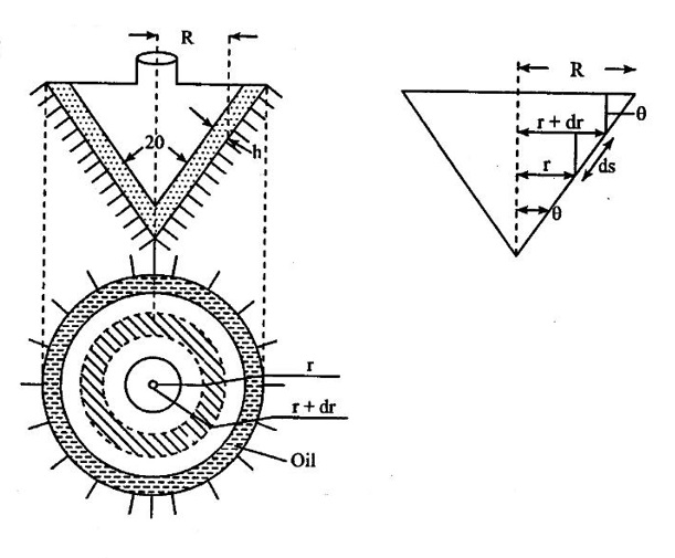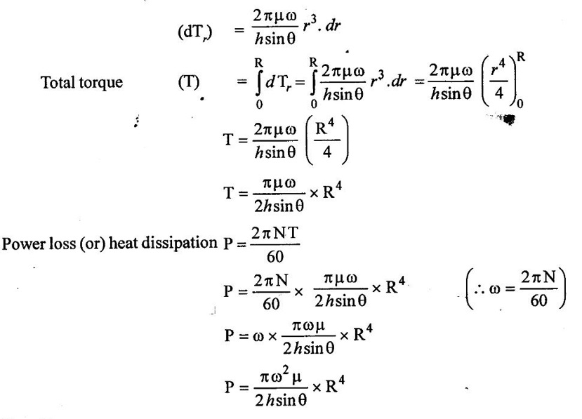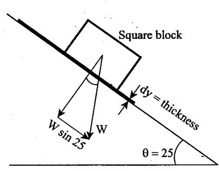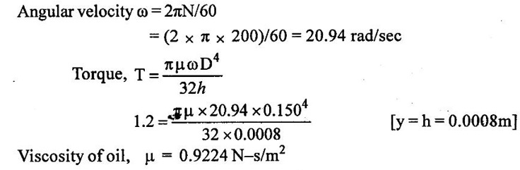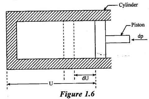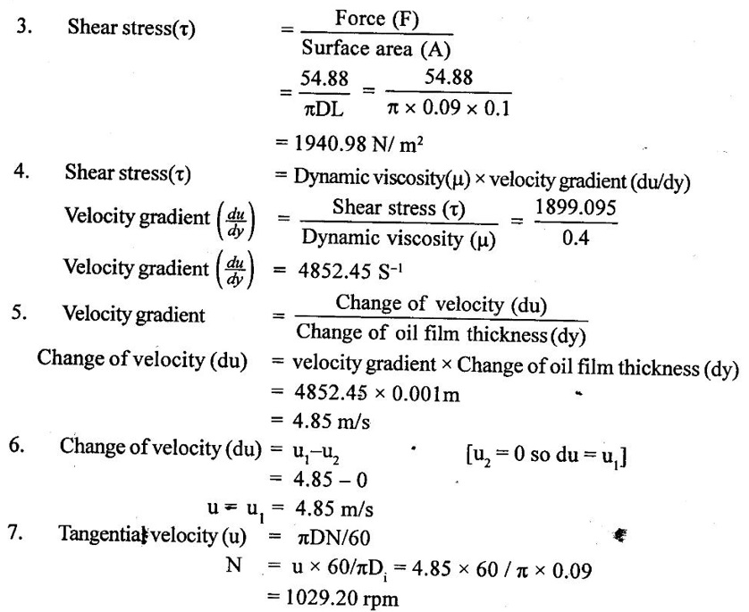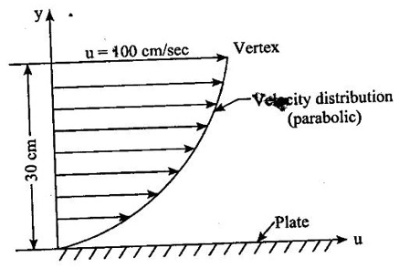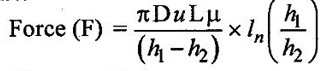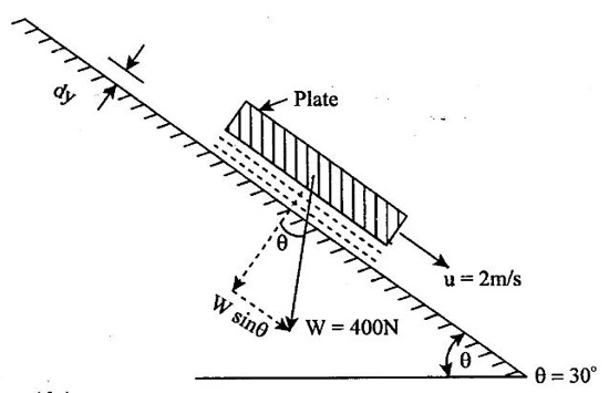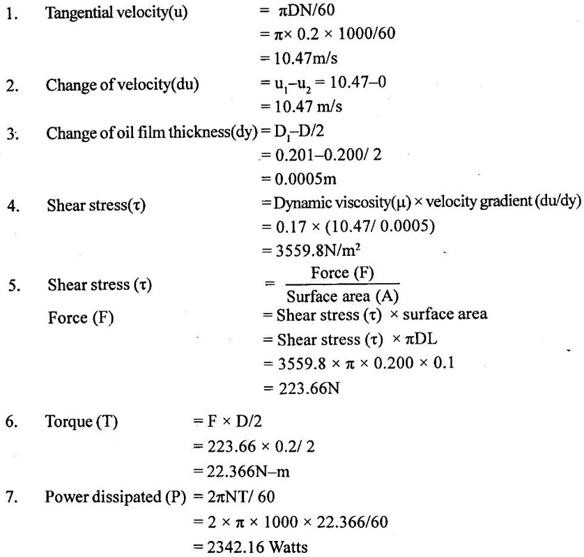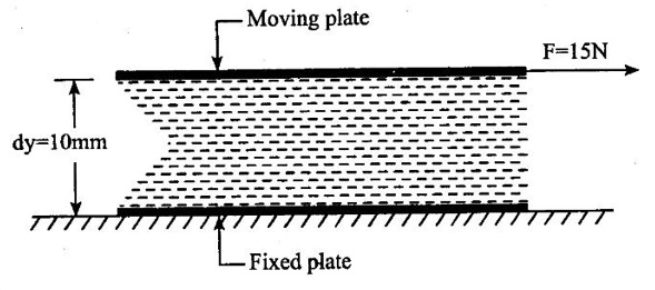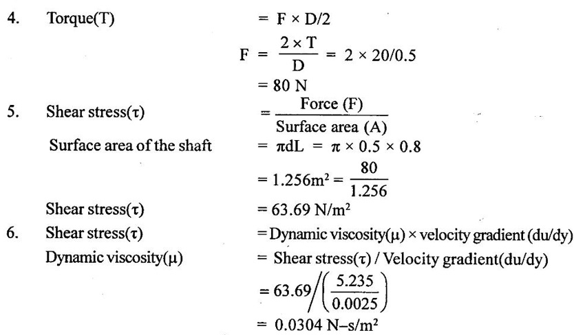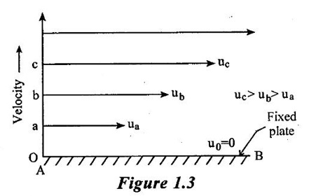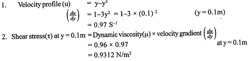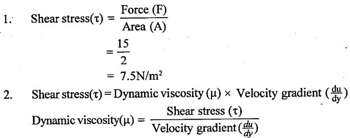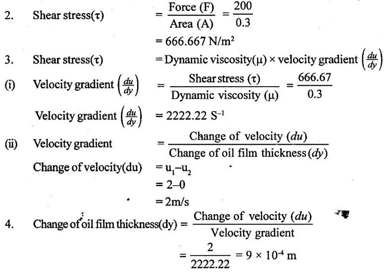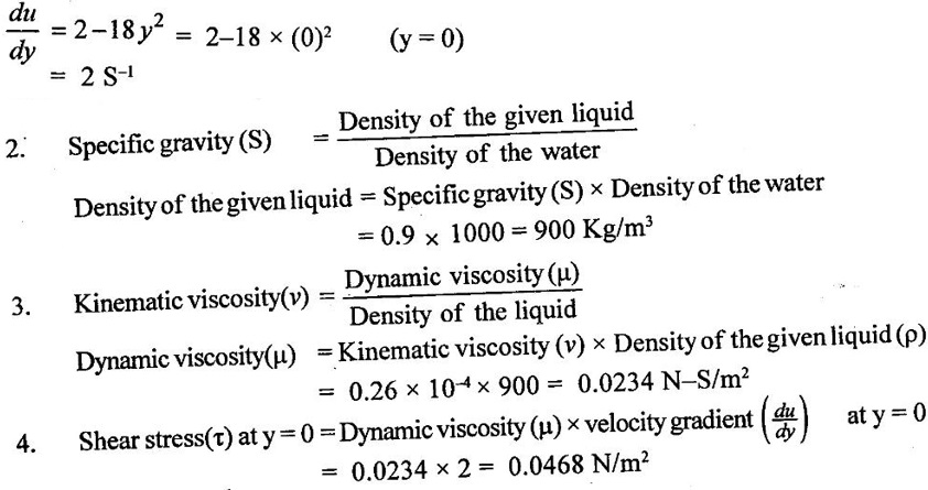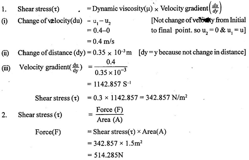 PROPERTIES OF FLUIDS Every fluid has certain characteristics which describe the physical condition of the fluid. Such characteristics are called properties of fluids. It is the mass of fluid per unit volume. It is also known as mass density (or) specific mass and is denoted by Greek letter ρ (rho). Density (ρ) = Mass (M) / Volume (U) unit in kg/m3 The density of water and air at the standard temperature of 4°C are 1000 Kg/m3 and 500 Kg/m3 respectively. It is the weight of fluid per unit volume. It is also known as weight density and is denoted by w. Specific volume is the volume of fluid per unit mass. It is the reciprocal of density. It is denoted by Us. It is the ratio of density of any given fluid to density of the standard fluid at standard temperature of 4°C. It is also defined as the ratio of specific weight of any given fluid to specific weight of the standard fluid at standard temperature of 4°C. It is also called as relative density and denoted by S. Specific gravity is a mere number and has no units The standard fluid is water for comparing liquid and air is the standard fluid for comparing gases. Specific gravity of water = 1 Specific gravity of mercury = 13.6 Specific gravity of air = 1 Example - 1 Calculate the specific weight, density and specific gravity of two litre of a liquid which weighs 9N. Given data: Volume (U) = 2 Litre = 2/1000 m3 (or) 2 × 10-3 (or) 0.002 m3 Weighs (W) = 9N To find: Specific weight(w), Density (p), Specific gravity(S) Solution: Specific gravity (S) = 0.458 No unit Result : 1. Specific weight (w) = 4500 N/m3 2. Density (p) = 458.71 Kg/m3 3. Specific gravity(S) = 0.458 No unit Example - 2 Calculate the specific weight, mass density, specific gravity and specific volume of oil having a volume of 10000cm3 and weight of 30N. Given data: Volume (U) = 10000cm3 = 10000 / 1000000 m3 (or) 0.01 m3 Weight (W) = 30N To find (i) Specific weight (w) (ii) Mass density (ρ) (iii) Specific gravity (S) (iv) Specific volume (Vs) Solution : Result : (i) Specific weight (w) = 3000 N/m3 (ii) Mass density (ρ) = 305.81Kg/m3 (iii) Specific gravity (S) = 0.305 No unit (iv) Specific volume (U) = 3.27 × 10-3 m3/ Kg It is the resistance offered to the movement of one layer of fluid over another adjacent layer under the action of a shear force. This property of fluid is called viscosity. A fluid is a material which will continues to deform with the application of shear stress. However, different fluid deforms at different rates when the same shear stress is applied. Viscosity is used to determine the amount of resistance to shear stress. The property of viscosity can be seen in the following: 1) We cannot walk fast in water as compared to air as water has comparatively larger viscosity. 2) A stirred liquid comes to rest an account of viscosity. 3) If we pour honey and water on a table then the honey will stop flowing soon while the water will flow for a large distance as it has small viscosity as compared to honey. Considered a fluid placed between two horizontal parallel fluids each of area A and the plates by y apart (Assume the plates to be large enough so that the edge effects may be ignored). Let the upper plate be moved with a velocity U relative to the lower plate by the application of a shearing force F. since the upper plate moves, the fluid particles in contact with the upper plate also move with the velocity U. The lower plate is at rest and the fluid particles in contact with the lower plate are also at rest. Let us consider that the fluid body between the two plates consists of a number of layers parallel to the plates. These different layers of the fluid have different velocity. This results in a continuous shear deformation of the body. 1. Velocity gradient due to viscosity: When a solid mass slides over a surface, a frictional force is developed to oppose the motion, similarly when a layer of a fluid slides over another layer of the same fluid; a frictional force is developed between them opposing the relative motion. This opposite (or) tangential force is called the viscous force. Suppose a fluid is moving in stream lined manner on a fixed horizontal surface AB as shown in the figure 1.3. The layer of the fluid in the contact of the fixed surface remains stationary (at rest), while the velocity of layer increases with distance from the fixed surface. In the figure 1.3, the length of arrows represents the increasing velocity of the layers from the fixed surface. Consider three parallel layers a, b and c from the fixed surface, then their velocities are in the increasing order. The layer a tends to retard the layer b and layer b tends to retard the layer c. Therefore each layer tries to decreases in velocity of the layer above it. It also means that each layer tries to increase the velocity of the layer below it. Therefore there is an internal tangential resistive force acting between the two layers which are opposing their relative motion. This force is called viscous force. In order to maintain the flow of the fluid, we have to apply an external force to overcome this tangential resistive or viscous force. In the absence of external force, the viscous force will resist the flow and bring the fluids to rest. 2. Newton's law of viscosity: The tangential shear stress (τ) existing between two adjacent fluid layers is directly proportional to the velocity gradient (du/dy) in the fluid in a direction perpendicular to the fluid layer. τ α du/dy τ = μ (du/dy) where τ - Shear stress in N/m2 du - Change in velocity in m/s dy - Change in distance or fluid film thickness in m. du/dy - Velocity gradient in S-1 μ - Co-efficient of viscosity (or) Dynamic viscosity in Ns/m2 (or) Absolute viscosity 3. Derivation of Newton's Law of viscosity: A thin layer of fluid which is contained between two parallel plates shown in figure 1.4(a). The upper plate is moved by tangential force F while that lower plate is kept stationary. The movement of upper plate is resisted by
