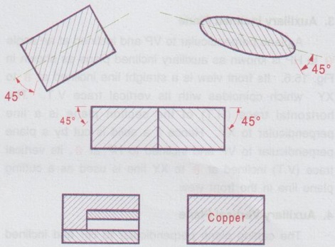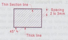 REPRESENTATION OF THE SECTION The section is indicated by a closed boundary using thickline and is filled with section lines. The section lines are drawn using thin lines of equal spacing from boundary to boundary. The spacing of section lines can be 2 to 3mm depending on the size of drawing. The section lines are drawn at an angle of 45° (towards left or right) to the boundary line. The process of drawing section lines is called "hatching". The following points should be observed while hatching. i) The section lines are normally drawn at 45° to the boundary line (towards left or right) at uniform spacing (2 to 3 mm) using thin lines. ii) If the boundaries of the object itself is inclined at 45° to the reference planes, hatching lines are drawn at 45° to the longitudinal axis of the sectioned surface. iii) The adjacent components in a sectional view shall be hatched in the opposite directions. iv) If more number of components exists with different properties exists at a section, these components are differentiated by hatching in opposite directions and / or spacing the hatching lines at closer intervals. v) As far as possible the text inside a sectioned surface should be avoided. In unavoidable situations, the hatching lines are to be drawn without crossing the text. vi) Draw the hatching lines at the end of a drawing. ie., only after finishing the drawing (ie. all the projections / views) and printing the text.