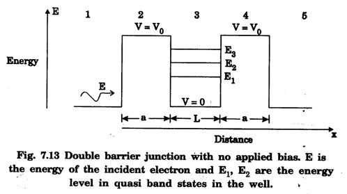 SCANNING TUNNELING MICROSCOPE (STM) A scanning tunneling microscope, or STM, is a type of electron microscope. It is commonly used in fundamental and industrial research. ● It is an instrument used for imaging surfaces at the atomic level. ● Due to its high resolution, individual atoms within materials are routinely imaged and manipulated. Note: Invented in the year 1981 by Gerd Binning and Heinrich Rohrer from IBM's Zurich Research Center in Switzerland. It helped them to win Nobel Prize in Physics in the year 1986. It is based on the concept of quantum mechanical tunneling of electrons. ● In this technique, a sharp narrow conducting needle (probe) or tip is brought very near to the surface to be examined (Fig. 7.7) ● A small voltage difference about 1V is applied between the tip and the surface of the material ● This allows electrons to tunnel through the vacuum between them and results in tunneling current. ● Information about surface morphology is obtained by monitoring the tunneling current. The tip's position scans across the surface and it is usually displayed in image form The components of STM include 1. Scanning needle tip 2. Piezoelectric controlled height and surface (x, y) scanner. 3. Coarse sample to tip control 4. Vibration isolation system and 5. Computer ● Needle tip for scanning the sample surface. It is often made of tungsten. ● Piezoelectric tube is provided with tip and electrodes. It is capable of moving X, Y, Z directions. It is used to maintain the tip position with respect to the sample and scanning the sample. ● Coarse sample to tip control is used to bring the tip close to the sample. ● Vibration isolation systém: It prevents any vibration or sound in the system ● The computer is used to acquire the data and it may also used for enhancing the image with the help of image processing as well as performing quantitative measurement. The sharp metal needle is brought close to the surface to be imaged. The distance is of the order of a few angstroms. ● A bias voltage is applied between the sample and the tip. When the needle is at a positive potential with respect to the surface, the electrons can tunnel through the gap and set up a small "tunneling current" in the needle. This feeble tunneling current is amplified and measured ● With the help of the tunneling current, the feedback electronics keeps the distance between tip and sample constant. ● Once tunneling is established, the tip's bias and position with respect to the sample can be varied and data are obtained from the resulting changes in current. ● If the tip is moved across the sample in the x - y plane, the changes in surface height and density of states causes changes in tip current. These changes are mapped in images to present the surface morphology. ● This change in current with respect to position can be measured itself, or the height Z of the tip corresponding to a constant current can be measured. These two modes are called constant height mode and constant current mode, respectively. STMs are helpful because they can give researchers a three dimensional profile of a surface. It allows researchers to examine a multitude of characteristics, including roughness, surface defects and determining things about the molecules such as size and conformation. ● For an STM, good resolution is 0.1 nm lateral resolution aneh 0.01 nm depth resolution. ● The high resolution of STMs enable researchers to examine surfaces at an atomic level. ● Capable of capturing much more detail than other microscopes. This helps researchers better understand the subject of their research on a molecular level. ● STMs are also versatile. They can be used in ultra high vacuum, air, water and other liquids and gasses. ● They will operate in temperatures as low as zero Kelvin up to a few hundred degrees Celsius. There are very few disadvantages of using a scanning tunneling microscope. ● STMs can be difficult to use effectively. There is a very specific technique that requires a lot of skill and precisions. ● STMs require very stable and clean surfaces, excellent vibration control and sharp tips. ● A small vibration even a sound, can distrub the tip and the sample together. ● Éven a single dust particle can damage the needle. ● STMs use highly specialized equipment that is fragile and expensive. ● The electronics require for STM are extremely sophisticated as well as very expensive 1. It is a powerful tool used in many research fields and industries to obtain atomic scale sample imaging and magnification. 2. One innovative applications of STM recently found is manipulation of atoms. For example, Iron atoms are placed on Cu surface and dragged by the STM tip and moves across the surface to a desired position. 3. It is used to analyze the electronic structures of the active sites at catalyst surfaces. 4. (STM is used in the study of structure, growth, morphology, electronic structure of surface, thin films and nano structures. An interesting phenomena occurs when two barriers of width a separated by a potential well of small distance L as shown in fig. 7.13. This leads to the concept of resonant tunneling. For example, assume that incident electrons have energy E and that all the energy states En lie above E, as shown in fig. 7.14. The barriers are sufficiently thin to allow tunneling and the well region between the two barriers is also sufficiently narrow to form discrete (quasi-bound) energy levels, as shown in fig. 7.13. The transmission coefficient of the double symmetric barrier becomes unity (ie., T = 1), when the energy of the incoming electron wave (E) coincides with the energy of one of the discrete states formed by the well. where n = 1, 2, 3 ... Thus, transmission probability of the double symmetric barrier is maximum and hence, the tunneling current reaches peak value when the energy of electron wave is equal to quantised energy state of the well. This phenomenon is known