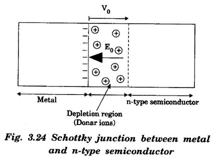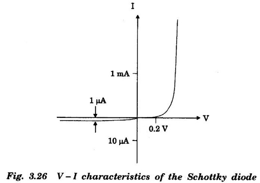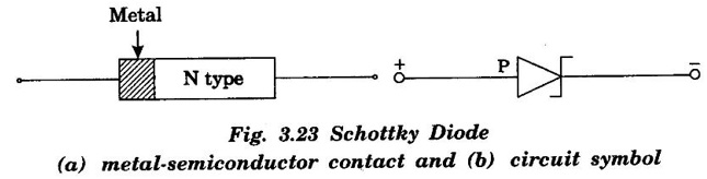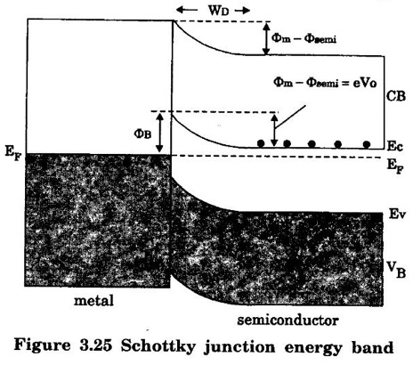 SCHOTTKY DIODE It is a junction formed between a metal and n-type semiconductor. When the metal has a higher work function than that of n-type semiconductor then the junction formed is called schottky diode. The Fermi level of the semiconductor is higher (since its work function is lower) than the metal. Fig. 3.23 shows schottky diode and its circuit symbol. The electrons in the conduction level of the semiconductor move to the empty energy states above the Fermi level of the metal. This leaves a positive charge on the semiconductor side and a negative charge (due to the excess electrons) on the metal side as shown in figure 3.24. This leads to a contact potential. When a Schottky junction is formed between metal and semiconductor, Fermi level lines up. Also a positive potential is formed on the semiconductor side. The formation of a depletion region of width WD within the semiconductor is shown in figure 3.25. Because the depletion region extends within a certain depth in the semiconductor, there is bending of the energy bands on the semiconductor side. Bands bend up in the direction of the electric field produced in depletion region. There is a built in potential V0 in the Schottky junction. From the figure 3.25, this is given by the difference in work functions. The contact potential thus formed prevents further motion of the electrons between the metal and semiconductor. This is called the Schottky barrier and denoted by ϕB. The behaviour of the schottky diode is further studied by biasing (applying voltage). The voltage is applied in two ways (a) Forward bias (b) Reverse bias In this bias, metal is connected to positive terminal and n-type semiconductor is connected to negative terminal of the battery. In the forward biased Schottky junction, the external potential opposes the in-built potential. The electrons injected from the external circuit into the n-type semiconductor have a lower barrier to overcome before reaching the metal. This leads to a current in the circuit which increases with increasing external potential. In reverse bias, metal is connected to negative terminal and n-type semiconductor to positive terminal of the battery. In the case of a reverse bias, the external potential is applied in the same direction as the junction potential. This increases the width of depletion region further and hence there is no flow of electron from semiconductor to metal. So a Schottky junction acts as a rectifier ie. it conducts in forward bias but not in reverse bias. The V-I characteristics of the junction is shown in figure 3.26. There is an exponential increase in current in the forward bias while there is a very small current in reverse bias. • In schottky diode, stored charges or depletion region is negligible. So a schottky diode has a very low capacitance. • In schottky diode, the depleting region is negligible. So the schottky diode will immediately switch from ON to OFF state (fast recovery time). • The depletion region is negligible in schottky diode. So applying a small voltage is enough to produce large current. • It has high efficiency. • It operates at high frequencies. • It produces less noise. • Schottky diode can be used for rectification of signals of frequencies even exceeding 300 MHz. • It is commonly used in switching device at frequencies of 20 GHz. • It is used in radio frequency (RF) applications. • It is widely used in power supplies. • It is used to detect signals. • It is used in logic circuits. • Its low noise figure finds application in sensitive communication receivers like radars. • It is also used in clipping and clamping circuits and in computer gating. Note: This diode is also referred as hot carrier diode because when it is forward biased, conduction electrons on the N side gains sufficient energy to cross the junction and enter the metal. Since these electrons enter into the metal with large energy, they are commonly called as hot carrier. Table 3.7Definition: