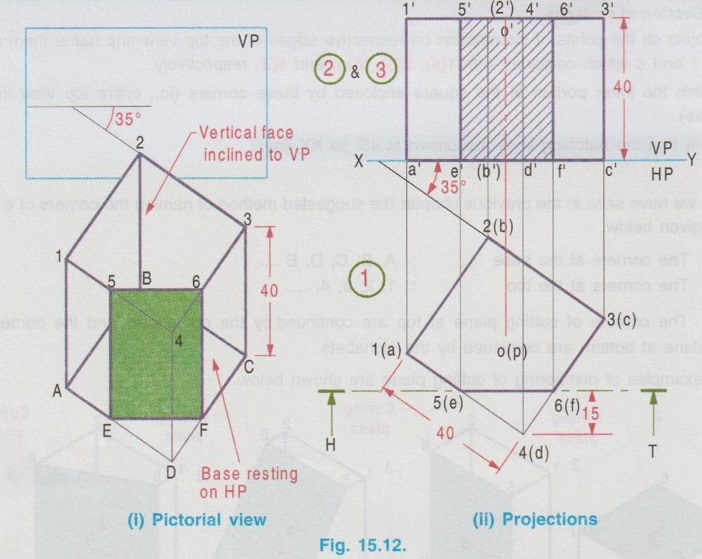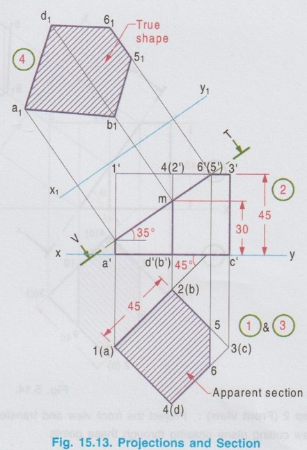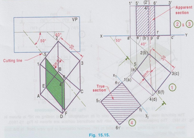 SECTIONS OF CUBE Example 1: A cube of side 25 mm rests on HP such a way that one of its faces with a vertical face inclined at 30° to VP. A plane parallel to HP and perpendicular to VP cuts the cube 15 mm above HP. Draw its front view and sectioned top view. The pictorial view of the cube with cutting plane is shown in Fig. 15.11(i), cut by a Horizontal plane 5-6-7-8, 15 mm above HP. Draw the projections of full solid first as described in the previous chapter without considering the cutting plane and then draw the sectional views with the cutting plane. Construction of Projections (Fig. 15.11 ii) Step 1 (Top view) 1. Draw the reference line XY. 2. Draw the top view of cube as a square of side 25 mm, keeping one of its edges inclined at 30° to XY (given in the problem). 3. Name the corners, showing the hidden corners within the bracket. Step 2 (Front view) 4. Draw the vertical projectors through the corners. 5. Complete the front view of the cube as a rectangle of height 25 mm (ie. side of cube) and name the corners. 6. Draw V.T of the section plane parallel to and 15 mm above the XY line. It cuts the edges of the cube in the front view as 5', (6'), 8' and 7'. Step 3 (Sectioned surface) 7. Project all the points of intersection on respective edges of the top view and name them as 5, 6, 7 and 8 which coincides with 1(a), 2(b), 3(c), and 4(d) respectively. 8. Hatch the inner portion of the square enclosed by these corners (ie., entire top view in this case). Note that the hatching lines are drawn at 45° to XY line. Note: 1) As we have seen in the previous chapter the suggested method of naming the corners of a solid is given below. The corners at the base : A, B, C, D, E .... The corners at the top : 1, 2, 3, 4, … The corners of cutting plane at top are continued by the numericals and the corners of cutting plane at bottom are continued by the alphabets. Some examples of numbering of cutting plane are shown below. 2. Examination point of view, the pictorial view is not required; However it is suggested to draw the pictorial view of the solid with cutting plane by free hand sketch and name the various corners. Then the projections can be drawn with a clear understanding of position of cutting plane and proper way of numbering on projections. 3. If the solid is resting on HP, (ie in simple position, axis perpendicular to HP and parallel to VP), always draw the top view first and then draw the front view. 4. When a solid is cut by a horizontal plane, the section seen on top view itself is its true shape. 5. Similarly if a solid is cut by a vertical plane, the section seen in front view itself is its true shape. 6. But if a solid is cut by an inclined plane (either inclined to HP or inclined to VP), the sections seen in topview (or) front view are only the apparent sections. Hence true shapes of these cases are to be drawn, by projecting the sectioned surface to a plane parallel to the cutting plane. Example 2: A cube of 40 mm side rests on HP on one of its faces with a vertical face inclined at 35° to VP. A plane perpendicular to HP and parallel to VP cuts the cube at 15 mm nearer to the observer. Draw the top view and the sectional front view. The pictorial view is shown in Fig. 15.12(i). Let the cutting plane be 5-6-F-E as shown in fig. The top view and the sectioned front view are shown in fig. 15.12(ii). Step 1 (Top view): Draw the reference line XY, and draw the top view of the cube as a square of side 40 mm with a side making an angle of 35° with XY using thin line. The cutting plane is perpendicular to HP. Hence it is seen as a straight line ie., draw the H.T of the plane which is a line parallel to XY at 15 mm nearer to the observer. Assume that the portion in between the cutting plane and the observer is removed. Hence draw the edges of the remaining portion using thicklines. Name the corners showing the hidden edges within the bracket. Step 2 (Front view): Complete the front view as a rectangle of height 40 mm using thin lines. Project the points of intersection of cutting plane with the edges 1(a) - 4(d) and 4(d) - 3(c) to the front view to intersect the top edge at 5' and 6' and the bottom edge at e' and f'. Name the other corners systematically. Step 3 (Section): Draw the outerlines and the visible edges of the section 5' - e' and 6' - f' using thicklines. Hatch the section enclosed by the points 5'-6'-f'-e'-5' using thin lines, inclined at 45° to XY. Since the cutting plane is perpendicular to HP, the section shown in front view is the true shape of the section. Example 3: A cube of side 45 mm is resting on HP with one of its faces. Two of its adjacent vertical faces make equal angles with VP. It is cut by a plane which is perpendicular to VP and inclined at 35° to HP and passing through a point on the axis at 30 mm from the base. Draw the front view, sectional top view and true shape of the section. Step 1 (Top view): Draw the top view of a square of side 45 mm keeping two adjacent edges makes angles of 45° with XY. Step 2 (Front view): Complete the front view as a rectangle of height 45 mm and name the corners systematically. Step 3 (Apparent Section): Mark a point m on the axis in front view, 30 mm above XY. Draw V.T of the cutting plane through this point at an angle of 35° with XY to intersect the top edge at 6'(5'). Draw the vertical projector through this point to cut the edges 2(b) - 3(c) and 4(d) - 3(c) at 5 and 6 respectively. Step 4 (True section): Draw the axis X1Y1 parallel to the cutting plane at any convenient distance. Project the points of intersection of cutting plane from front view perpendicular to the cutting plane (ie., perpendicular to X1Y1). Mark the corresponding points a1, b1, 51, 61 and d1 on the projectors drawn from the respective points. Note that the distance of a from reference axis xy is equal to the distance of a1 from the new reference axis X1Y1. Similarly the other points b1, 51 etc.. may be marked. Draw the outer edges of apparent 