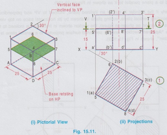 The pictorial view of the cube with cutting plane is shown in Fig. 15.11(i), cut by a Horizontal plane 5-6-7-8, 15 mm above HP.