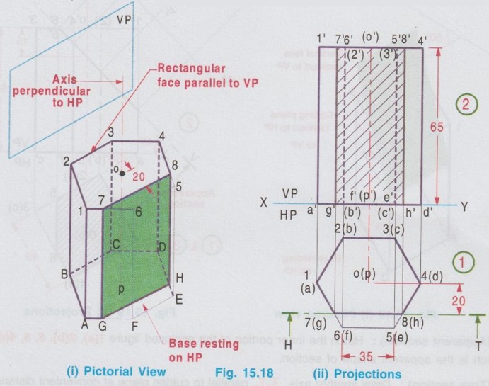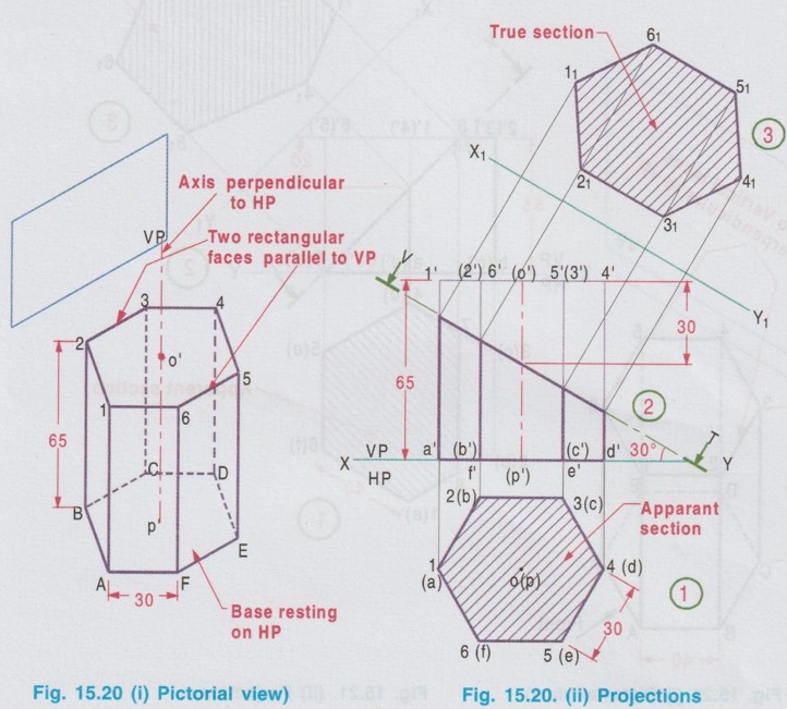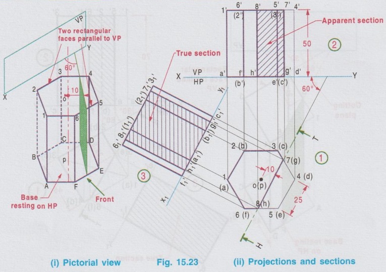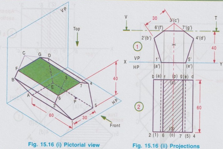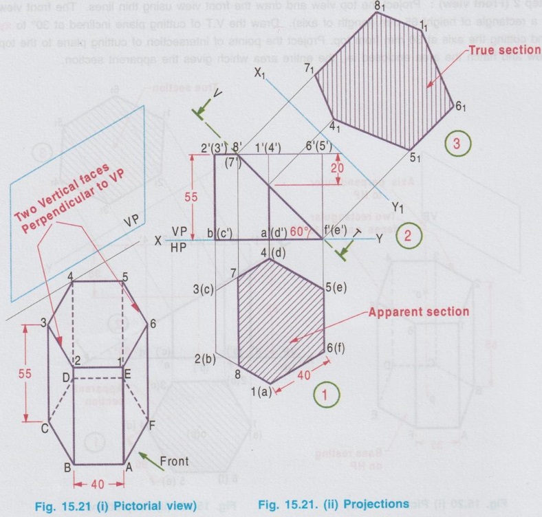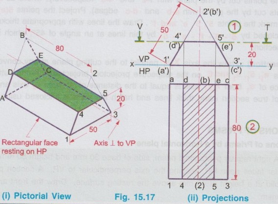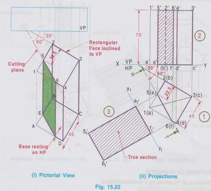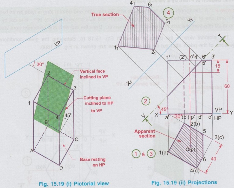 SECTIONS OF PRISMS 1. Sections of Prisms by a Horizontal plane Example 6: A right regular pentagonal prism, side of base 30 mm and height 60 mm is lying on one of its rectangular faces upon HP, keeping the axis perpendicular to VP. A section plane parallel to HP cuts the solid at a height of 40 mm above the resting surface. Draw the front and sectional top views of the prism. Note: Since the cutting plane is parallel to HP, section obtained in top view itself is the true shape of section. Example 7: A triangular prism having a base with a 50 mm side and 80 mm long axis is lying on one of its rectangular faces in the HP with its axis perpendicular to VP. It is cut by a section plane parallel to and 20 mm above HP. Draw its front view and sectional top view. The pictorial view of the prism is shown in Fig. 15.17(i) and the projections are shown in Fig. 15.17(ii). 2. Section of Prism by a vertical plane Example 8: A Hexagonal prism having base with 35 mm side and 65 mm long is lying on its base in HP and one of the rectangular faces parallel to VP and axis perpendicular to HP. It is cut by a plane at 20 mm from the axis and towards the observer. Draw the top view and sectioned front view. The pictorial view of the prism is shown in Fig. 15.18 (i). Satisfying the given conditions. Projections of the prism after cut by the section plane are shown in Fig. 15.18(ii). 3. Sections of Prisms by planes inclined to HP and Perpendicular to VP Example 9: A square prism having a base with a 40 mm side and a 60 mm long axis rests on its base on HP such that one of the vertical faces makes an angle of 30° with VP. A section plane perpendicular to VP and inclined at 45° to HP, passing through the axis at a point 15 mm from its top end cuts the prism. Draw its front view, sectional top view and true shape of the section. The pictorial view of the square prism with the given conditions is shown in Fig. 15.19(i) and the projections with sections are shown in Fig. 15.19(ii). Step 1 (Top view): Draw a square of side 40 mm with an edge inclined at an angle 30° to XY line as the top view and name the corners. Step 2 (Front view): Project the corners and obtain the front view of the prism. Draw V. T of the cutting plane in the front view inclined at 45° to XY line and cut the axis at 15 mm from top edge. Let the cutting plane cut the edges 2(b)-3(c) and 3(c)-4(d) at 5 and 6 respectively. Project the points 5 and 6 to front view. Step 3 (Apparent section): Hatch the inner portion of the enclosed figure 1(a), 2(b), 5, 6, 4(d) and 1(a) which is the apparent shape of section. Step 4 (True section): Draw another axis X1Y1 parallel to cutting plane at convenient distance and project the points of intersection of cutting plane with the edges in front view, perpendicular to the cutting plane. Locate the points 11, 21 etc., on the projectors such that their distances from the X1Y1 line is equal to distances of 1, 2 etc., from the XY line respectively. Join the points 1121etc., in a sequence which represents the true shape of the section. Hatch the true section using thin lines inclined at 45°. Example 10: A Hexagonal prism of base side 30 mm and axis length 65 mm rests on one of its ends on HP with two rectangular faces parallel to VP. It is cut by a plane perpendicular to VP and inclined at 30° to HP. The cutting plane meets the axis at 30 mm from the top. Draw the front view, sectional top view and the true shape of the section. Pictorial view is shown in Fig. 15.20(i), resting on its base and two rectangular faces 2-3-C-B and 6-5-E-F) are parallel to VP. Cutting plane is inclined to HP meeting the axis at 30 mm from top. Projections with the sectional views are shown in Fig. 15.20(ii). Step 1 (Top view): Draw a hexagon as top view of side 30 mm, keeping two rectangular faces parallel to XY and name the corners by showing the hidden corners in the bracket. Step 2 (Front view): Project the top view and draw the front view using thin lines. The front view is a rectangle of height 65 mm (length of axis). Draw the V.T of cutting plane inclined at 30° to xy and cutting the axis at 30 mm from top. Project the points of intersection of cutting plane to the top view and hatch the area enclosed ie., the entire area which gives the apparent section. Step 3 (True section): Draw another axis X1Y1 at any convenient distance and parallel to XY. Project the points of intersection of cutting plane with the edges in front view perpendicular to the cutting plane. Locate the points 11, 21, 31 etc., such a way that the distances of these points from X1Y1 are equal to the distances of points 1, 2, 3 etc., respectively from XY. Join the points in proper sequence and hatch the area which gives the true shape of the section. Example 11: A Hexagonal prism of base side 40 mm and axis 55 mm long is resting on HP on one of its bases with two of the vertical faces perpendicular to VP. It is cut by a plane inclined at 60° to HP and perpendicular to VP, passing through a point at a distance 20 mm from the top base. Draw its front view, sectional top view and true shape of section. The pictorial view is shown in Fig. 15.21 (i) and the projections are shown in Fig. 15.21 (ii). The solution is self explanatory. 4. Sections of Prisms by planes inclined to VP and perpendicular to HP Example 12: A square prism having a base with 45 mm side and 70 mm long axis, rests on its base on HP such that one of its rectangular faces makes an angle of 30° with VP. It is cut by a section plane perpendicular to HP and inclined at 60° to VP such that the face which makes 60° with VP is bisected. Draw its sectional front view, top view and true shape of section. The pictorial view of the prism is shown in Fig. 15.22(i). Base is resting on HP, one of its rectangular faces is inclined at 30° to VP (ie., the edge 2-3), hence the other edge 1-2 is making an angle of 60° with VP. Cutting plane is bisecting the edge 1-2 at an angle of 60° with VP as shown in fig. 