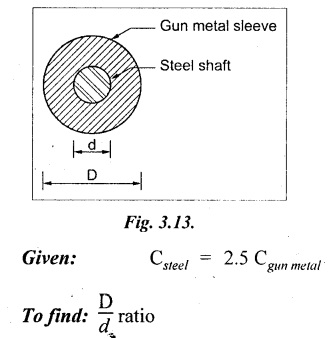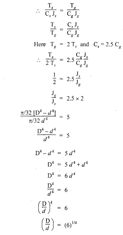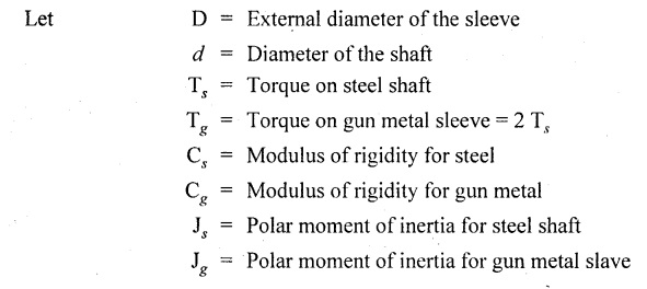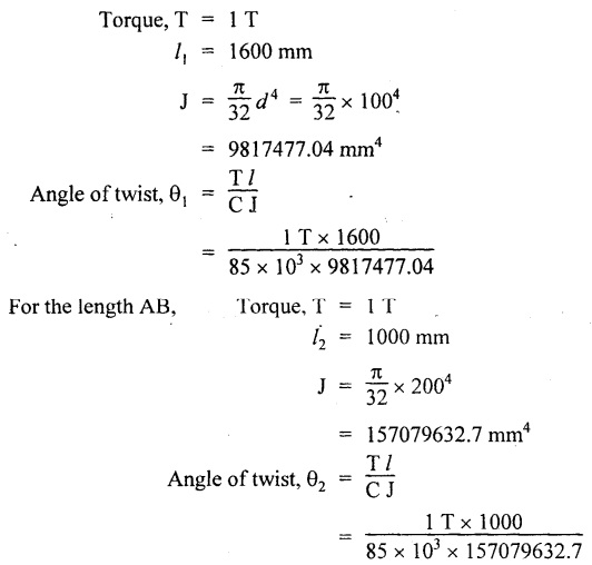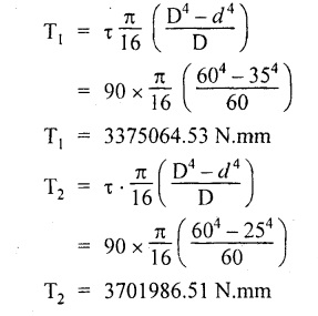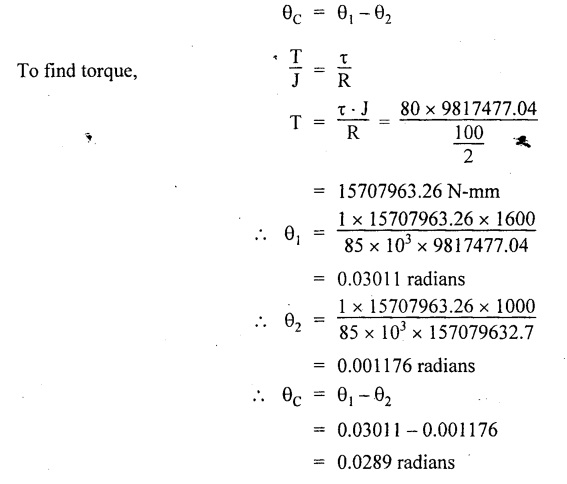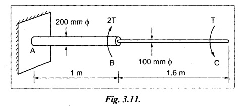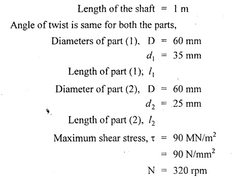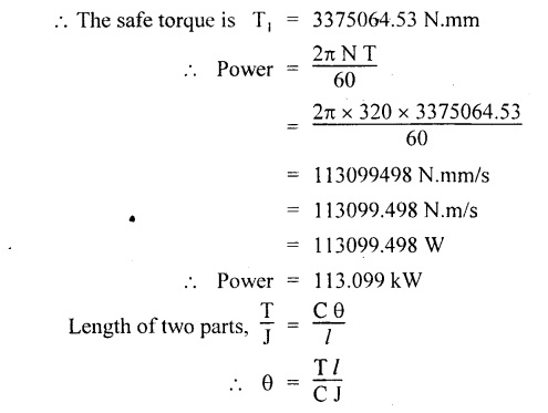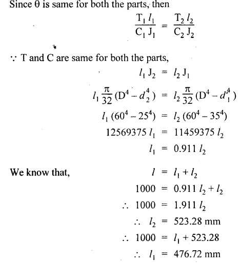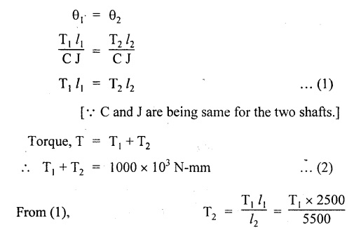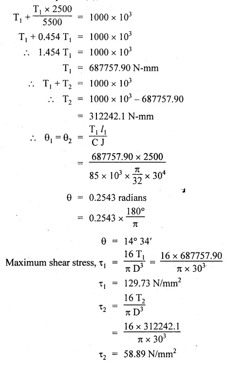 SHAFT IN SERIES In many situations, the composite of two shafts are connected in series. In this case, each shaft transmits the same torque but the angle of twist is the sum of the angle of twist of the two shafts connected in series. Here the driving torque is applied at one end and the resisting torque at the other end. When the driving torque is applied at the junction of the shafts and the resisting torque is a the other ends of the shafts, then the shafts are said to be in parallel. Here the angle of twist is same for each shaft, but the applied torque is divided between the two shafts. If the shafts are made of same material, If the shafts shared the torque equally, then Example 3.41 Find the total angle of twist at the free end, if the maximum 85 GN/m2. The stepped shear stress in the shaft is limited to 80 MN/m2. Take C steel shaft in Fig. is subjected to a torque T at the free end and a torque of 2T in the opposite direction at the junction of two sizes. Given: To find: Total angle of twist at free end. Solution: For the length BC, Here θ1, and θ2 are in opposite directions. ⸫ The total angle of twist at C, Result: Example 3.42 A solid steel shaft 8m long is securely fixed at each end. A torque of 1000 Nm is applied to the shaft at a section 2.5 m from one end. Find the fixing torques set up at the ends of the shaft. If the diameter of the shaft is 30 mm, what are the maximum shear stresses in the two portions? And calculate the angle of twist for the section where the torque is applied. Take C = 85 GN/m2. Given: To find: (i) Maximum shear stress in two shafts (ii) Angle of twist Solution: In this case, Substitute the above value in equation (2), Result: The compound shaft of a gun metal sleeve is fixed securely to a steel shaft as shown in Figure is subjected to a torque. Find the ratio of the external diameter of sleeve to the diameter of the shaft, if the torque on the sleeve is twice the torque on the shaft. Given: Solution: The steel shaft and gun metal sleeve are fixed together, so the length and angle of twist are same. Result: A hollow shaft is 1 m long and has external diameter 60 mm. It has 25 mm internal diameter for a part of length and 35 mm internal diameter for the rest of the length. If the maximum shear stress is not to exceed 90 MN/m2 , determine the maximum power transmitted by it at a speed of 320 rpm. If the twists produced in the two portions of the shaft are equal, find the the lengths of the two portions. Given: To find: Length of two parts of the shaft. Solution: Maximum power transmitted, Result: l1 = 476.72 mm, l2 = 523.28 mm