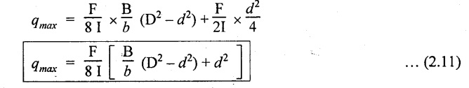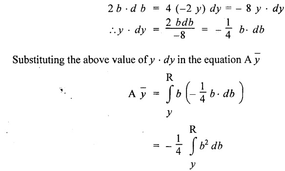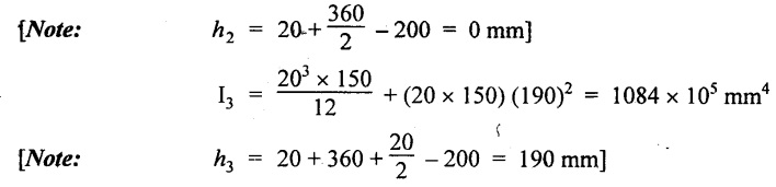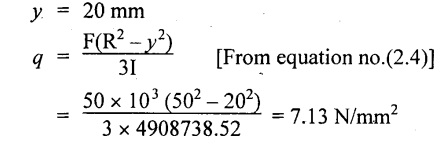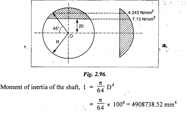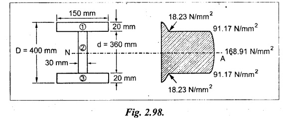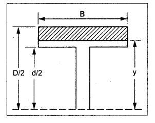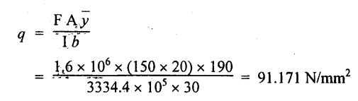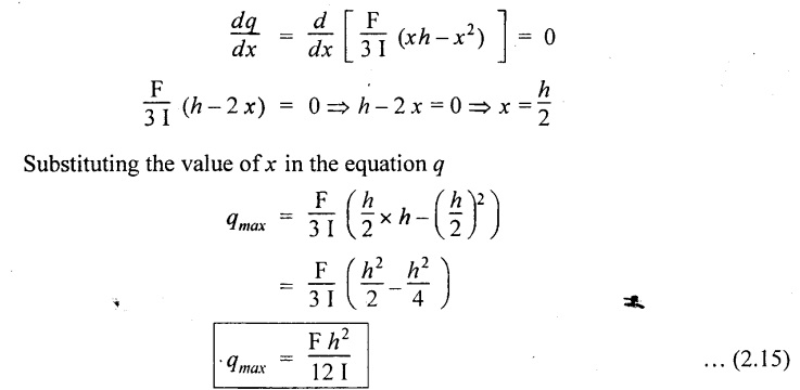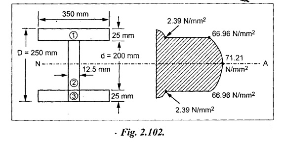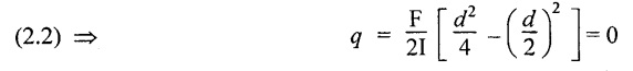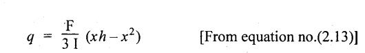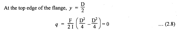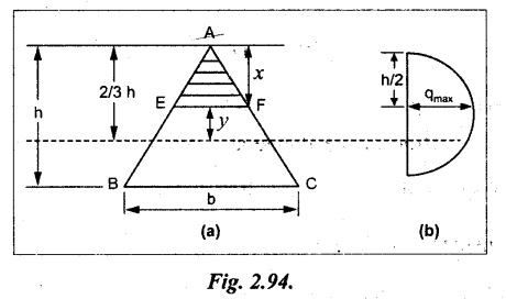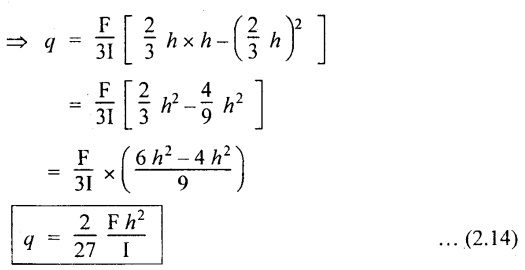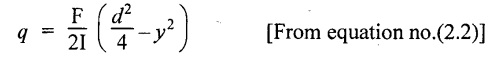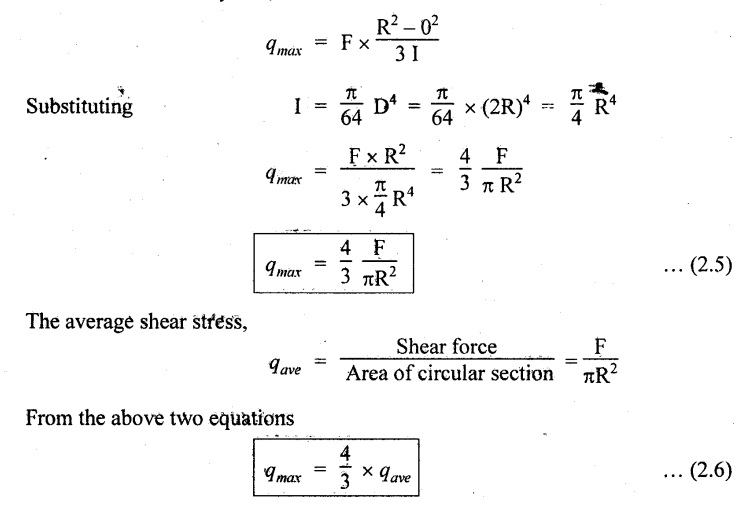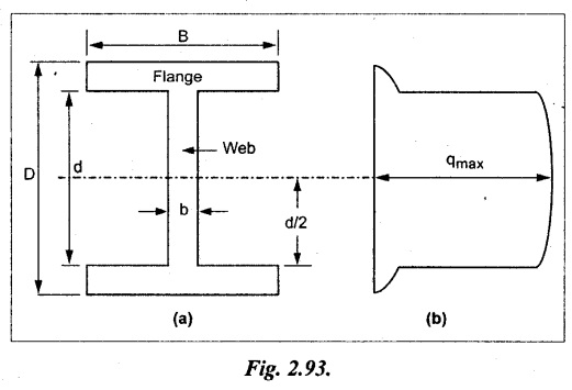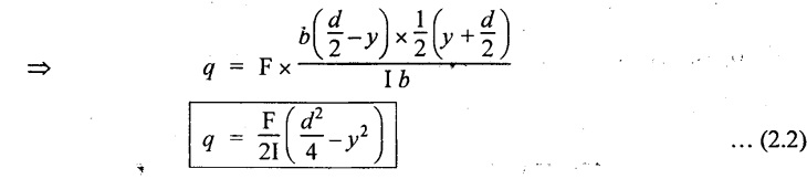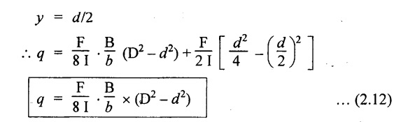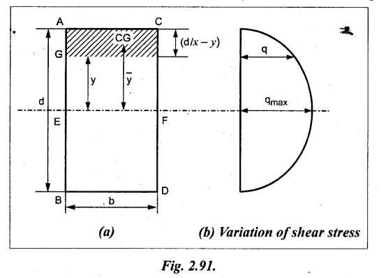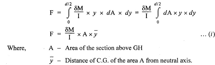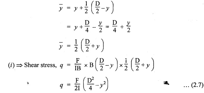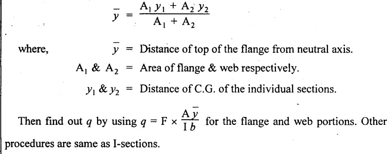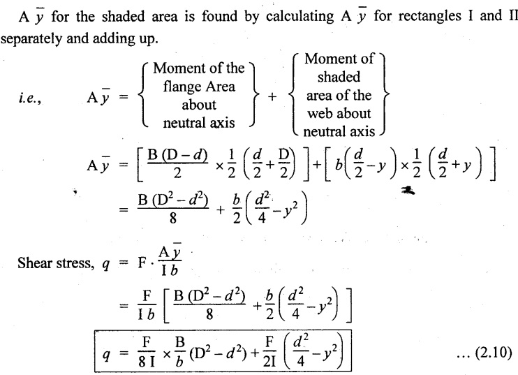 SHEAR STRESSES IN BEAMS In the previous chapter theory of simple bending we assumed that no shear force is acting on the section. But in actual practice, under the action of load, both the shear force and bending moment are induced. The effect of bending moment and how the cross section offers resistance has been studied in the theory of simple bending. Now let us consider the effect of shear force on the cross section of the beam. Consider a beam of uniform section subjected to bending moment M at the section AB and a bending moment M + δM at the section CD, and these two sections are kept dx distance apart as shown in Fig.2.90. Let σb be the stress at G due to M on a small area of width b and thickness dỵ. σb + δσb be the stress at H on a corresponding area of cross section CD. The net unbalanced force on the strip The total unbalanced force above the neutral layer may be found by integrating the above equation between 0 to d/2 To avoid the failure of the beam the unbalanced force developed above, the beam must offer shear resistance. This shear resistance at least must be equal to total unbalanced force to avoid failure due to shear. Shear resistance = Total unbalanced force Let, q - intensity of horizontal shear at the level EF b - width of the beam Area on which the shear force is acting = b × dx Shear force due to q = Shear stress × shear area = q × b × dx ……(ii) Equating the equation (i) and (ii) The above shear stress is the horizontal shear stress at the distance y from the neutral axis. But the complementary shear stress (i.e., vertical shear stress) is accompanied by the horizontal shear of the same quality. In this section we shall study the distribution of the shear stress along the depth of a beam. We have to calculate the intensity of shear stress at important sections of a beam and sketch a shear stress distribution diagram. The following are the important section in practical cases over which the shear stresses distribution to be obtained. 1. Rectangular section. 2. Circular section 3. I-section 4. T-section 5. Triangular section Consider a rectangular beam of which b and depth d as shown in Fig.2.91(a), We know that the shear stress at a distance y from neutral layer, where, A – Area of the section above y Substituting these values in the shear stress equation (i) From the above equation, we see that q increases as y decreases. The above equation is an equation of a parabola. At neutral axis when y = 0, Therefore the maximum shear stress is 3/2 times the average shear stress. At the top and bottom edge, when y = d/2 Therefore at the top and bottom edge, the shear stress is zero. The shear stress distribution is shown in Fig.2.91(b). To determine the distribution of shear stress in a beam of circular cross section of radius R, consider a elementary strip at a distance y from neutral axis of width b and thickness 't' as shown in Fig.2.92. We know that the shear stress on a layer AB at a distance y from the neutral axis, Moment of this area about the neutral axis, = y × dA Moment of whole shaded area about the neutral axis is obtained by integrating the above equation between limit y and R. We know that width of the strip AB, Differentiating both sides, From the diagram when y = y, width b = b and when y = R, width b = 0. Therefore the limits of integration may be changed from y & R to b and 0. From the above equation, the shear stress distribution across a circular section is parabolic. Also we see that q increases a y decreases. At y R, the shear stress q = 0. Hence shear stress will be maximum when y = 0. At neutral axis, when y = 0, Therefore the maximum 'shear stress is 4/3 times the average shear stress. The shear stress distribution is shown in Fig.2.92(b). To determine the distribution of shear stress in the I-section, let B and D be the overall breadth and depth of the I-section, b and d be the breadth and depth of web section as shown in Fig.2.93(a). The shear stress at a distance y from neutral axis is given by, In the I-section the shear stress distribution in the web and shear stress distribution in the flange are to be calculated separately. (a) Flange portion For flange portion, Distance of C.G. of the shaded area from Neutral axis, The variation of shear stress with respect to y in the flange is parabola. And also shear stress decreases with increase of y. Hence at the top edge of the flange q is 0. At the junction of the web and flange, y = d/2. (b) Web portion: Considering a portion of the web at a distance of y from neutral axis, The above equation is an equation of parabola. Also with increase of y, q decreases. At the neutral axis, y = 0 and hence shear stress is maximum. At the junction of the web and bottom of the flange, The shear stress distribution for the web and flange is shown in Fig.2.93(b). The shear stress at the junction of the flange and web changes abruptly. The equation F/8 I × (D2 - d2) gives the stress at the junction of the flange and the web when stress distribution is considered in the flange. But equation F/8 I × B / b × (D2 - d2) gives the stress at the junction when stress distribution is considered in web. By comparing the above equation it shows that the stress at the junction changes abruptly from The procedure for determining the shear stress distribution for T-section is similar to that of I-section. But here the section is not symmetrical about x-x axis. Therefore first we have find out the The shear stress distribution diagram is not symmetrical about x-x axis, since the section is not symmetrical about x-x axis. Consider a triangular section ABC with b as base and h as height. For triangular sections the neutral axis lies at a distance of 2/3 h from the top as shown in Fig.2.94(a). Consider an elemental strip EF at a distance of y from the neutral axis. The shear stress is given by From similar triangles ABC and AEF Width of the triangle AEF, Substituting EF value in A Substituting A The above equatio
