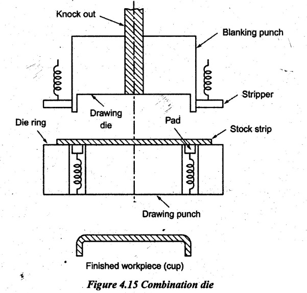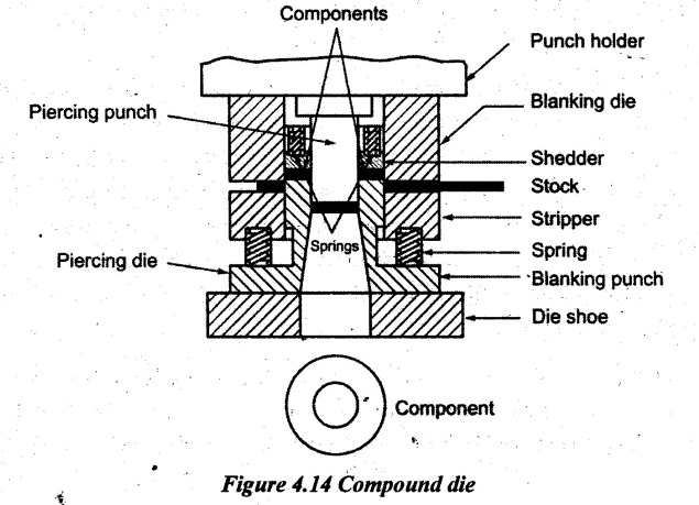 SHEARING DIES Die is a tool used to cut or shape the material in a press. Dies are custom designed on the basis of parts to be produced. A die set is the fundamental portion of every die. Figure 4.13 shows the components of a die. It consists of two halves such as upper shoe and lower shoe. The die block is attached on the lower shoe. The die opening (female part of the die set) is machined on the die block. The punch plate is attached on the upper shoe. The punch (male part of the die set) is fastened on the punch plate. Both die block and punch plate are separate from die shoes by backup plates. Both die shoes are connected by guide pins or guide posts which provide a precise alignment of these two halves during die operation. The dies may be classified according to the type of operation performed and according to the type of construction of die. The various types of dies are as follows. Simple dies are designed to perform any single specific operation such as blanking, punching, notching, trimming, etc. It consists of standard components of a die set. It may also be called a single operation die. Stop pins are also provided in the die for indexing the strip of sheet metal. Progressive die is also known as cut-carry die. It is a multi-station die that performs several operations in a single stroke of the ram in a press. The stock strip is advanced through a series of stations that perform one or more distinct die operations on the workpiece. The strip must move through each succeeding station to produce a complete workpiece. After that, a complete workpiece is produced with each stroke of the ram. Example, piercing operation is carried out in one station and it is further progressed to the next station to perform blanking operation. At the same time, the next piercing operation will be performed for the second washer while blanking the first washer. Figure 4.13 shows a progressive die to carryout both piercing and blanking operations. The stock strip is fed into the die mechanically or by hand. The primary stop is pushed-in by hand to hold against the lead end of the sheet metal. The primary die stop is drawn back after the hole is pierced. The hole is pierced by the piercing die set in the first cutting stroke of the ram. After the primary die stop is released, the stock advances to the next station where it contacts the automatic button die stop. The correct spacing is obtained by the help of a secondary stop pin. In the second cutting stroke of the ram, the pilot of the blanking punch enters the pierced hole and it ensures exact alignment of the stock as the part is blanked. At the same time, the blanking punch descends and shears the metal to form a washer. While the blanking operation is performed, the piercing punch produces a hole for the next washer at the first station. Thus, after the first stroke, when only a hole is punched, each stroke of the press produces a finished washer. The blanking and piercing punches should not be of same height. A stepping is given in order to reduce forces. For piercing operations, the punch will have the shear and the die will be flat. For blanking operations, the punch will be flat and the shear is given to the die. Advantages: (i) The number of operations can be performed with one handling of the stock strip. (ii) For every stroke of the ram, one workpiece is made. (iii) It is fairly simple to construct and it is more economical to repair. (iv) It is suitable for mass production. Disadvantages: (i) Thin stock of soft materials may cause troubles by bending or tearing around piloting holes. (ii) Workpiece may become dished as they are pushed through the die since they have less support. (iii) It is complicated design of die set as compared with simple dies. (iv) The cost of die set is high when compared to simple die set. In a compound die, two or more cutting operations such as blanking and piercing operations are combined and carried out in one stroke of the press at one station only. In order to perform this operation, both upper and lower elements of the die set carry punching and blanking elements are placed directly opposed to each other. In other words, the piercing punch acts in the opposite direction with respect to the blanking punch. Figure 4.14 shows a simple compound die. It is used for producing a workpiece (i.e., washer) which is pierced and blanked at one station in one stroke. Here, the blanking punch also serves as the piercing die. The blanking punch and blanking die opening are mounted in an inverted position. The sidewalls adjacent to cutting edges of the blanking die opening are straight because the blank does not pass through the die. During part of the stroke, the hole is pierced on the stock and upon further travel, the blanking operation is done. Angular clearance must be provided on the piercing die to allow slugs to drop through the die. The main difference between progressive and compound dies is, 'N numbers of washers can be produced in 'N' strokes of ram in the case of compound dies but 'N+1' strokes are needed to produce 'N' washers for progressive dies. The progressive and compound dies are mainly used to perform cutting operations. Advantages: (i) More accurate workpiece can be produced. (ii) Large parts can be blanked in a small press if compound dies are used. (iii) Shorter length of strip materials can be used. (iv) The cost of production is less. Disadvantages: (i) It is more expensive to construct and repair. (ii) It is slower in operation as compared with progressive dies. (iii) The design of the die set is complicated when compared to progressive dies. (iv) The tonnage requirement is high. Comparison between progressive and compound dies: In combination dies, in addition to cutting operations, non-cutting operations are also performed. In other words, both cutting and non-cutting operations (forming) are combinedly carried out in one stroke of the press. The typical cutting operations that may be perfor