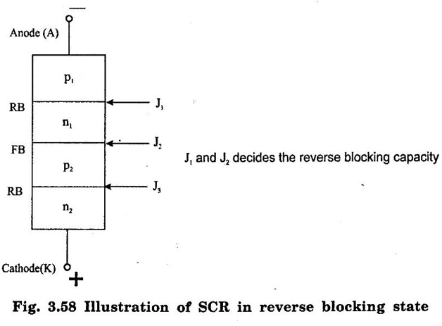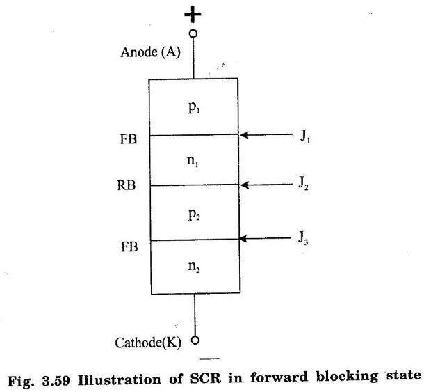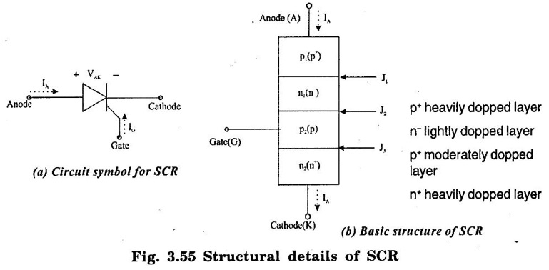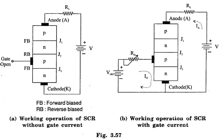 SILICON CONTROLLED RECTIFIER (SCR) SCR is one of the oldest type of solid state power device. It was invented in 1957 by the Generate Electric Research Laboratories. SCRs have the highest power handling capacity of all the power semiconductor devices. They have a four layer construction with three user accessible terminals SCR is a latching type device that can be turned on by the control terminal (gate) but once turned on the gate loses control on it (i.e. it cannot be turned by the gate) Important Features of SCR (i) It is a latching type device. (ii) It can handle a very laerge power. (iii) It is a current controlled device, because the gate current controls SCR. (iv) It acts as an open or closed switch. (v) It can handle thousands of amperes of current. The basic structure of SCR has been shown in figure 3.55(b). It is a four layer pnpn device, with three terminals brought out for the user, namely Anode, Cathode and Gate. The gate terminal is the control terminal that can turn on the device whenever required. The symbol of SCR has been shown in figure 3.55(a). It is essentially the symbol of a rectifying diode with a third control terminal, the gate added to it. The direction of forward anode current, voltage across the thyristor and direction of conventional gate current have been shown in figure.3.55(a) Number of Junctions As observed from figure 3.55(b), there are three junctions J1, J2 and J3. In order to turn on SCR, the anode must be at a higher positive potential than cathode. This means that SCR must be forward biased. Current Directions The directions of the anode and gate current in figure 3.55(a) are conventional directions. It clearly indicates that SCR is a unidirectional device and that the gate current can be only positive. The gate current can flow only in one direction i.e. into the gate terminal. The I-V characteristics of SCR is a graph of anode current IA on y-axis and anode to cathode voltage plotted on the x-axis as shown in figure 3.56. The I-V Characteristics can be split into two parts namely the forward characteristics and reverse characteristics. The characteristics in the reverse direction (anode to cathode voltage negative) is similar to a reverse biased diode. For small reverse voltage, a small reverse leakage current flows until the avalanche breakdown takes place at reverse break over voltage VBR. As soon as the reverse breakdown takes place due to avalanche breakdown, a large current flows through SCR whereas the voltage across the device remains constant. It is dangerous to operate SCR in the reverse breakdown state because it may get damaged due to overheating. The region from 0 volts upto VBR Volts in which the SCR is reverse biased and non-conducting is called as reverse blocking state. 1. Forward characteristics under: The forward characteristics may be divided into three regions of operation as (i) Forward blocking state (ii) Transition state (iii) The Low Voltage High Current Mode or the ON state (i) Forward blocking state : This is the high voltage low current mode of operation in which SCR is in the OFF state. The current through it is Forward Leakage Current. This current flows due to thermally generated minority carriers. (ii) Transition state: SCR remains in the blocking state as long as the forward anode to cathode voltagage is less than the break over voltage. As soon as VAK becomes greater than the break over value, the anode current IA increases sharply to a high value and the voltage across SCR reduces sharply to a low value (on state voltage). The switching of SCR from off state to on state and viceversa takes place in a short time. This change over state is called as transition state. As this is an unstable state, it is shown by dotted line in figure. (iii) The Low Voltage High Current Mode or the ON state The voltage across SCR is low in this state. In the on state a high power SCR can conduct average currents as large as 2000 amp with on state voltage drop of a few volts. 2. Unstable state These two stable starts or modes are connected together by an unstable mode (called as the transition mode) of proportion that appears as a negative resistance on the I-V characteristics. (dotted line in figure 3.56) The important voltage and current terms in the I-V characteristics may be listed as under : (i) The forward breakover voltage (VBO) This is the maximum forward voltage that can be applied between anode and cathode, without initiating forward conduction. This voltage is defined for a zero gate current. In short, this is the maximum forward voltage across SCR in its off state. (ii) The forward leakage current This is the small current flowing in the forward direction in the off state of the device. This current is generated due to the minority current carriers and therefore is dependent on the operating temperature. (iii) The holding current (IH) It represents the minimum current that can flow through SCR and still hold it in the on state. The accompanying voltage is termed as holding voltage VH. If the forward anode current is reduced below holding current, SCR will be turned off. The holding current is defined for zero gate current (IG = 0) (iv) ON state voltage It may be noted that the voltage across SCR in its on state is very low as compared to the off state voltage. It will be proved later on that the on state voltage is equal to drop across one junction (i.e. the order of 1 to 1.5 volts) (v) Latching current (IL) It is minimum anode current that must flow through SCR to latch it into the on state. The latching current is higher than the holding current. The latching current is important when SCR is being turned on. Working operation of SCR can be explained under two different operating conditions. These two operating conditions are as under : 1. Working Operation Without Gate Current Let us consider figure 3.57(a). The gate terminal of SCR is left open so that IG = 0. SCR is forward, biased by applying a positive voltage to ano