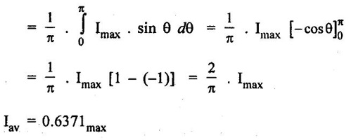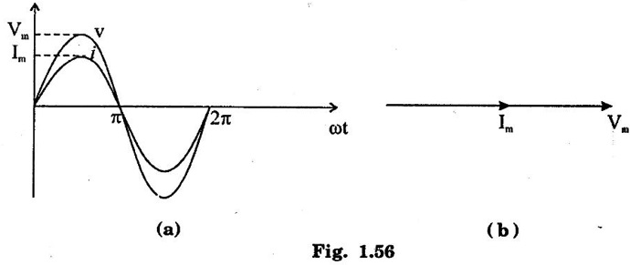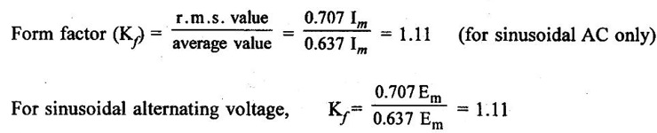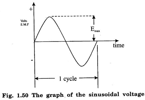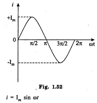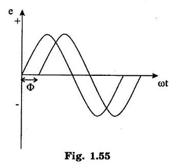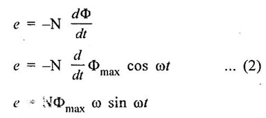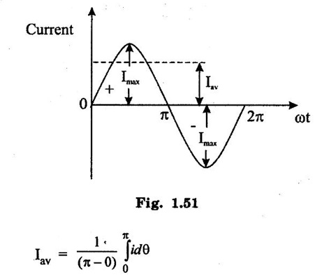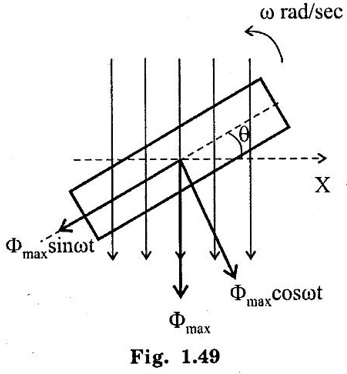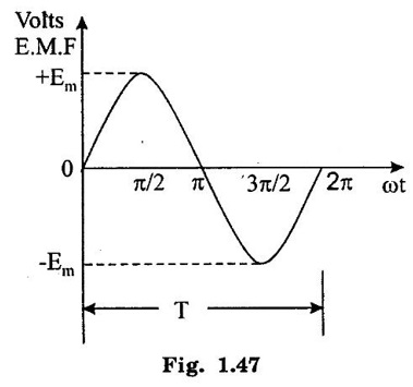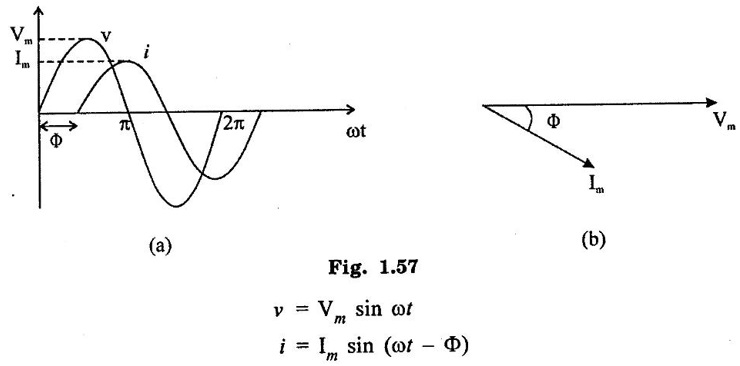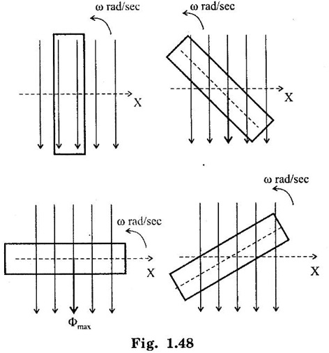 SINGLE PHASE AC CIRCUITS A current or voltage which alternates its direction and magnitude every time. Advantages of AC system over DC system 1. AC voltages can be efficiently stepped up/down using transformer. 2. AC motors are cheaper and simpler in construction than DC motors. 3. Switchgear for AC system is simpler than DC system. 4. More voltage can be generated (upto 33000V) than DC (650 V only). Consider a rectangular of N turns placed in a uniform magnetic field as shown in the figure 1.48. The coil is rotating in the anticlockwise direction at an uniform angular velocity of o rad/sec. When the coil is in the vertical position, the flux linking the coil is zero because the plane of the coil is parallel to the direction of the magnetic field. Hence at this position, the emf induced in the coil is zero. When the coil moves by some angle in the anticlockwise direction, there is a rate of change of flux linking the coil and hence an emf is induced in the coil. When the coil reaches the horizontal position, the flux linking the coil is maximum, and hence the emf induced is also maximum. When the coil further moves in the anticlockwise direction, the emf induced is the coil reduces. Next when the coil comes to the vertical position, the emf induced becomes zero. After that the same cycle repeats and the emf is induced in the opposite direction. When the coil completes one complete revolution, one cycle of AC voltage is generated. The generation of sinusoidal AC voltage can also be explained using mathematical equations. Consider a rectangular coil of N turns placed in a uniform magnetic field in the position shown in the figure 1.49. The maximum flux linking the coil is in the downward direction as shown in the figure 1.49. This flux can be divided into two components, one component acting along the plane of the coil Φmax sin ωt and another component acting perpendicular to the plane of the coil Φmax cos ωt. The component of flux acting along the plane of the coil does not induce any flux in the coil. Only the component acting perpendicular to the plane of the coil, (i.e.,) Φmax cos ωt induces an emf in the coil. It is determied from the relation. where Φmax = Maximum flux which can link with the coil t = Time taken by the coil to move through an angle Φ from vertical position. Using Faraday's law to equation (1), in order to the determine the voltage equation As the value of e will be maximum when sin of ωt = 1. Now equation (2) can be written as, e = Em sin ωt Hence the emf induced in the coil is a sinusoidal emf. This will induce a sinusoidal current in the circuit given by i = Im sin ωt Modern alternators produce an e.m.f. which is for all practical purposes sinusodal (i.e., a sine curve), the equation between the e.m.f. and time being where e = Instantaneous voltage; Emax = Maximum voltage ; ωt = Angle through which the armature has turned from neutral. Taking the frequency as ƒ hertz (cycles per second), the value of ω will be 2πƒ, so that the equation reads e = Emax sin (2πf) t The graph of the voltage will be as shown in fig. 1.46. 1. Cycle: One complete set of positive and negative values of an alternating quantity is known as a cycle. A cycle may also sometimes be specified in terms of angular measure. In that case, one complete cycle is said to spread over 360° or 2π radians. 2. Amplitude: The maximum value, positive or negative, of an alternating quantity, is known as its amplitude. 3. Frequency (f): The number of cycles/second is called the frequency of the alternating quantity. Its unit is hertz (Hz). 4. Time period (T): The time taken by an alternating quantity to complete the cycle is called its time period. Time period is reciprocal of frequency. 5. Root mean square (R.M.S) value: The r.m.s. (or effective) value of an alternating current is given by that steady (D.C) current which when flowing through a given circuit for a given time produces the same heat as produced by the alternating current when flowing through the same circuit for the same time. R.M.S. value is the value which is taken for power purposes of any description. This value is obtained by finding the square root of the mean value of the squared ordinates for a cycle or half cycle. (fig. 1:50). The equation of sinusoidal alternating current is given as : i = Imax sin θ The mean of squares of the instantaneous values of current over half cycle is Note: While solving problems, the values of given current and voltage should always be taken as the r.m.s. values, unless indicated otherwise. 6. Average or Mean value: The average value of an alternating current is expressed by that steady current which transfers across any circuit the same charge as is transferred by that alternating current during the same time. The mean value is only of use in connection with process where the results depend on the current only, irrespective of the voltage, such as electroplating or-battery charging. The value of instantaneous current is given by (Refer Fig. 1.51) i = Imax sin θ Refer Fig. 1.47. The value of instantaneous current is given by : i = Imax sin θ [θ = ωt] [Limits are taken from 0 to л, since only first half cycle is considered. For whole cycle, the average value of sine wave is zero]. Note: In case of unsymmetrical alternating current viz. half-wave rectified current the average value must always be taken over the whole cycle. Form factor: The ratio of r.m.s. (or effective) value to average value is the form factor (Kf) of the wave form. It has use in voltage generation and instrument correction factors. Peak factor: The ratio of maximum value to the rms value is called as peak factor (Kp) of the waveform. An alternating quantity can be represented using (i) Waveform (ii) Equations (iii) Phasor A sinusoidal alternating quantity can be represented by a rotating line called a Phasor. A phasor is a line of definite length rotating in anticlockwise direction at a constant angular velocity. The w