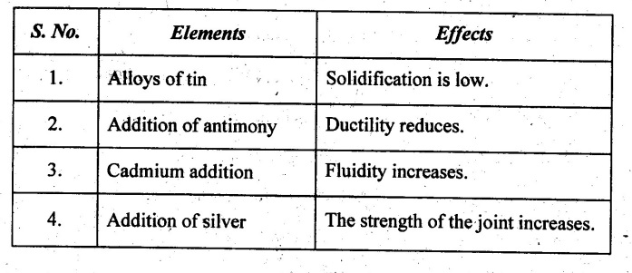 SOLDERING The process of joining of two dissimilar metals by means of filler metal called solder is known as soldering whose melting temperature is below 450°C. Soft soldering being a low temperature (300°C) process does not bring the distortion. The soldering joints are weaker. when compared to brazed joints. The soldered joint is generally considered to be a metallurgical bond between solder filler metal and base metals being joined. Some solder joints do not have a metallurgical bond but they are held to gather by adhesion properties of the interface. The solder alloy is applied as a liquid metal that wets and spreads in the joint, and generally forms a layer of an inter-metallic compound with a small amount of the base metal. Upon solidification, the joint is held together by the same attraction between adjacent atoms that holds a piece of solid metal together. A solder should have the following characteristics. 1. It acts as a good adhering film. 2. It wets the base metal. 3. It freely flows over surfaces. 4. It has good capillary action. The tin and lead are most widely used solders. The selection of solder depends on: 1. Melting and spreading characteristics 2. Resistance to corrosion 3. Temperature requirement 4. Materials cost 5. Ductility and strength. Flux is intended to enhance the wetting of base materials by the solder by tarnish films from pre-cleaned surfaces and preventing oxidation during the soldering operation. The selection of flux depends on the following other factors: 1. Cost 2. Flux type 3. Joint design and the parent material 4: Temperature 5. Solder type 6. Ventilation and room temperature 7. Corrosiveness. The various steps in soldering process are as follows: 1. Surface cleaning 2. Flux application 3. Surface tinning 4. Parts holding 5. Solder applications. The types of soldering are: 1. Hard soldering 2. Soft soldering 3. Dip soldering 4. Wave soldering: 1. Hard soldering: In hard soldering, the filler metal is silver. It is also known as silver soldering. This method is more expensive than plain brazing because the filler metal is more expensive. This hard soldering method is used for joining electrical and refrigeration parts. 2. Soft soldering: This is the most commonly used soldering method. In this method, soldering iron is a copper rod with a thin tip which is used for flattering the soldering material. The soldering iron can be heated by keeping in a furnace or by means of an electrical resistance. The filler metal used in soft soldering is called soft solder. The various solders used in soft soldering are: 3. Dip soldering: In this method, a large amount of solder is melted in a closed tank. Then, the parts to be soldered are cleaned and properly dipped in a flux bath as per the requirement. It is then dipped into the molten solder pool and lifted after completing the soldering process. 4. Wave soldering: It is a different method in which the parts to be soldered is not dipped into the solder tank but wave is generated in the tank. So, the metal solder comes up and the joint is made. It is used for mass production of the electronic equipment. The other methods of soldering are: 1. Oven soldering 2. Resistance soldering 3. Induction soldering and 4. Infrared soldering. In resistance and induction soldering methods, the electric energy is used to join the metals. In infrared soldering, the ultrasonic sonic waves are used.1. Typical Solders and their Applications