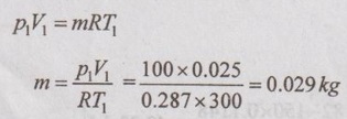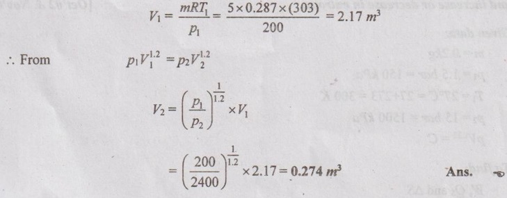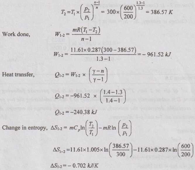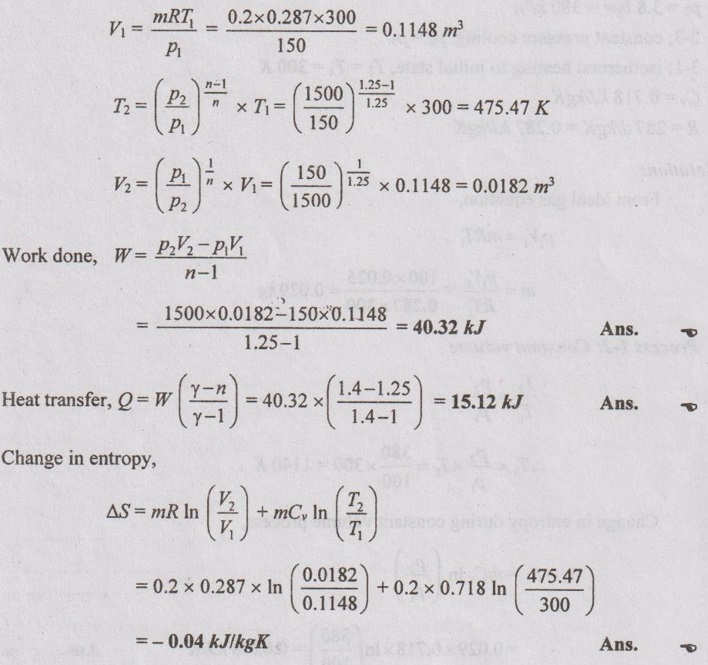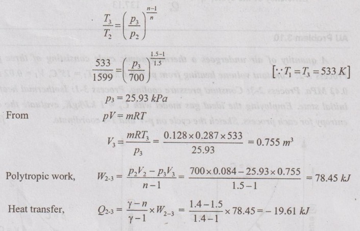 SOLVED ANNA UNIVERSITY PROBLEMS ON ENTROPY PRINCIPLES AU Problem 3.1 Air in a closed vessel of fixed volume 0.15 m3 exerts pressure of 12 bar at 250°C. If the vessel is cooled so that the pressure falls to 3.5 bar, determine the final temperature, heat transfer and change of entropy. Given data: V1 = 0.15 m3 p1 = 12 bar = 1200 kN/m2 T1 = 250°C = 273 + 250 = 523 K p2 = 3.5 bar = 350 kN/m2 To find: T2, Q and ΔS Solution: From ideal gas equation, For constant volume process, Heat transfer, Q = mCv (T2 - T1) (Negative sign indicates that the heat is rejected from the system) AU Problem 3.2 A certain gas has Cp =1.968 kJ/kgK and C, = 1.507 kJ/kgK. Find its molecular weight and the gas constant. A constant volume chamber of 0.3 m3 capacity contains 2 kg of this gas at 5°C. Heat is transferred to the gas until the temperature is 100°C. Find the work done, the heat transferred and the change in internal energy, enthalpy and entropy. Given data: Cp = 1.968 kJ/kgK C = 1.507 kJ/kgK V1 = 0.3 m3 For constant volume process, V2 = V1 = 0.3 m3 m = 2 kg T1 = 5°C = 5 + 273 = 278 K T2 = 100°C = 100 + 273 = 373 K Solution: AU Problem 3.3 In an isothermal process 1000 kJ of work is done by the system at a temperature of 200°C. What is the entropy change of the process? Given data: Work done, W = 1000 kJ Temperature, T = 250°C = 250 + 273 = 473 K Solution: For isothermal process, work done = Heat transfer AU Problem 3.4 A fluid undergoes a reversible adiabatic compression from 4 bar, 0.3 m3 to 0.08 m3 according to the law pV1.25 = C. Determine the change in enthalpy, change in internal energy and change in entropy. Given data: p1 = 4 bar 400 kPa V1 = 0.3 m3 V2 = 0.08 m3 Solution: According to the law, pV1.25 = C We know that for adiabatic process, Heat transfer, Q = 0 From first law of thermodynamics, Q = W + ΔU 0 = -187.96 + ΔU AU Problem 3.5 5 kg of air at 2 bar and 30°C is compressed to 24 bar pressure according to the law pv1.2 = constant. After compression air is cooled at constant volume to 30°C. Determine the (i) volume and temperature at the end of compression, (ii) change of entropy during compression and (iii) change in entropy during constant volume cooling. Take Cp = 1.005 kJ/kg K, Cv = 0.718 kJ/kg K. Given data: m = 5 kg p1 = 2 bar = 200 kPa T1 = 30°C = 30 + 273 = 303 K p2 = 24 bar = 2400 kPa pV1.2 = constant T3 = 30°C = 30 + 273 = 303 K Cp = 1.005 kJ/kg K Cv = 0.718 kJ/kg K To find: V2, T2, S2 - S1 and S3 - S2 Solution: According to the law, pv1.2 = C ⸫ p1V11.2 = p2V21.2 From characteristic gas equation, pV = mRT Similarly, Change in entropy during compression, AU Problem 3.6 0.2 kg of air at 1.5 bar and 27° C is compressed to a pressure of 15 bar according to the law pv1.25 Constant. Determine the work done on or by air, heat flow to or from the air and increase or decrease in entropy. Given data: m = 0.2kg p1 = 1.5 bar = 150 kPa T1 = 27°C = 27 + 273 = 300 K p2 = 15 bar = 1500 kPa pV1.25 = C To find: W, Qs and ΔS Solution: By general gas equation, p1V1 = mRT1 AU Problem 3.7 In a closed system, air is at a pressure of 1 bar, temperature of 300 K and volume of 0.025 m3. The system executes the following processes during the completion of thermodynamic cycle: 1-2; constant volume heat addition till pressure reaches 3.8 bar, 2-3; constant pressure cooling of air, 3-1; isothermal heating to initial state. Determine the change in entropy in each process. Take Cv = 0.718 kJ/kgK, R = 287 J/kgK. Given data: p1 = 1 bar = 100 kPa T1 = 300 K V1 = V2 = 0.025 m3 1-2; constant volume heat addition till pressure reaches p2 = 3.8 bar = 380 kPa 2-3; constant pressure cooling, p2 = p3 3-1; isothermal heating to initial state, T3 = T1 = 300 K Cv = 0.718 kJ/kgK R = 287 J/kgK = 0.287 kJ/kgK Solution: From ideal gas equation, Process 1-2: Constant volume Change in entropy during constant volume process, Process 2-3: Constant pressure cooling Process 3-1: Constant temperature process AU Problem 3.8 5 m3 of air at 2 bar, 27°C is compressed up to 6 bar pressure following pV1.3 constant. It is subsequently expanded adiabatically to 2 bar. Considering the two processes to be reversible, determine the network, net heat transfer and change in entropy. Also plot the processes on T-s and p-V diagrams. Given data: V1 = 5 m3 P1 = 2 bar = 200 kN/m2 T1 = 27°C = 27 + 273 = 300 K P2 = 6 bar = 600 kN/m2 pV1.3 = C ⸫ n = 1.3 Process 1-2: Polytropic Process 2-3: Reversible adiabatic p3 = 2 bar = 200 kN/m2 To find: W, Q, ΔS and T-s and p-V diagrams Solution: Process 1-2: Polytropic process From general gas equation, p1V1 = mRT1 From polytropic process relation, Process 2-3: Adiabatic process From adiabatic process relation, AU Problem 3.9 A mass of air is initially at 260°C and 700 kPa and occupies 0.028 m3. The air is expanded at constant pressure to 0.084 m3. A polytropic process with n = 1.5 is then carried out, followed by a constant temperature process. All the processes are reversible. 1. Sketch the cycle in p - V and T-s planes. 2. Find the heat received and heat rejected in the cycle. 3. Find the efficiency of the cycle. Given data: T1 = 260°C = 273 + 260 = 533 K p1 = 700 kPa = p2 V1 = 0.028 m3 V2 = 0.084 m3 Process 1-2 is constant pressure Process 2-3 is polytropic Process 3-1 is constant temperature To find: Sketch p-V and T-s diagram, Q and η Solution: Process 1-2: Constant pressure process Process 2-3: Polytropic process For polytropic process, Process 3-1: Constant temperature process T1 = T3 = 260°C = 533 K for constant temperature process AU Problem 3.10 A quantity of air undergoes a thermodynamic cycle consisting of three processes. Process 1-2: Constant volume heating from p1 = 0.1 MPa, T1 = 15°C, V1 = 0.02 m3 to p2 = 0.42 MPa. Process 2-3: Constant pressure cooling. Process 3-1: Isothermal heating to the initial state. Employing the ideal gas model with Cp = 1 kJ/kgK, evaluate the change of entropy for each process. Sketch the cycle on p-V and T-s coordinate. [Ans:- For process 1-2, S2 - S