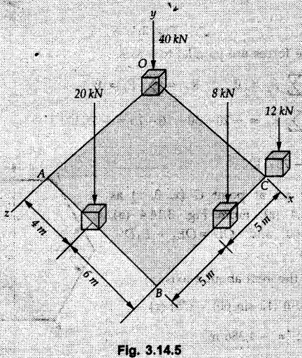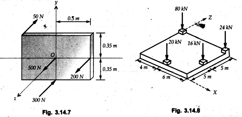 Solved Examples for Understanding Example 3.14.1 The slab in Fig. 3.14.1 is subjected to parallel forces. Determine the magnitude and direction of resultant force equivalent to the given force system and locate its point of application on the slab. Solution: Let the resultant act at point(x,y,0) on the slab. Using Varignon's theorem about Y-axis, (600) (8) - (100)(6) = (1400)(x) Using Varignon's theorem about X-axis, (100)(5) - (400)(10) = −(1400)(y) The resultant acts at point (3, 2.5, 0) on the slab. Example 3.14.2 Find resultant of the four parallel forces shown in Fig. 3.14.2. Where will it act ? Solution: Rx = Ry = 0 as all given forces are in Z-direction. Rz = -4 – 3 + 5 – 6 = - 8 ⸫ R = 8 kN↓ Let this resultant act at point (X, Y, 0). Taking moment about Y-axis, using Varignon's theorem, 4 × 4 + 3 × 1 – 5 × 2 + 6 × 1 = 8 × X ⸫ X = 1.875 Using Varignon's theorem about X-axis. - 3 × 1 + 5 × 3 – 6 × 4 = -8 × Y ⸫ Y = 1.5 ⸫ The resultant acts at (1.875, 1.5, 0) m Example 3.14.3 ABCDEFGH is a regular octagon of side 4 m. Fig. 3.14.3 shows positions of six columns which carry vertical forces normal to plane of octagon and acting at its six corner points. Locate the resultant of these forces w.r.t. centroid of octagon 'O'. Solution: Consider the top view as shown in Fig. 3.14.3 (a). As all forces are in z-direction, Example 3 14 4 A concrete mat in the shape of a regular hexagon of 12 m sides (ABCDEF) supports four column loads as shown. Determine resultant and co-ordinates of point where it acts on the mat. Also find additional loads which must be applied at B and F so that resultant of six parallel forces will pass through center of mat. Solution: As all the forces are parallel to y-axis, ⸫ Resultant acts at point G (4.8, 0, 1.386). Let W1 and W2 act downwards at B and F respectively. Then using Varignon's theorem about x-axis. (W1) (12 sin 60)- (W2) (12 sin 60) + (10) (12 sin 60) (20) (12 sin 60) = 0 ⸫ W1 - W2 = 10 ... (1) Using Varignon's theorem about z-axis, (W 1) (6) + (W 2) (6) + (15) (12) - (20) (6) − (10) (6) — (30) (12) = 0 ⸫ W1 + W2 = 60 ... (2) From equation (1) and (2), Example 3.14.5 A square foundation mat supports the four columns as shown in Fig. 3.14.5. Find the magnitude and point of application of the resultant of the four loads. Solution : Let the resultant act at point (x, 0, z). Using Varignon's theorem about z-axis, −(20)(4) - (12)(10) – (8)(10) = (80) (x) ⸫ x = 3.5 m Using Varignon's theorem about x-axis, (8)(5) + (20)(10) = (80)(z) ⸫ Z = 3 m ⸫ Point of application of the resultant is (3.5, 0, 3) m. Example 3.14.6 Find the resultant force and its location of the force system`shown in Fig. 3.14.6. The (x, z) coordinates of the points of application of the forces are given in metres. Solution : Examples for Practice Q.1 Determine the resultant completely, for a system of four parallel forces acting on the wooden board 1m × 0.7 m as shown in Fig. 3.14.7. Q.2 A square foundation mat supports four columns as shown in Fig. 3.14.8. Determine magnitude and point of application of resultant of four loads. [Ans. : R = 140 N↓, x = 3.43 m, y = 0, z = 8m]