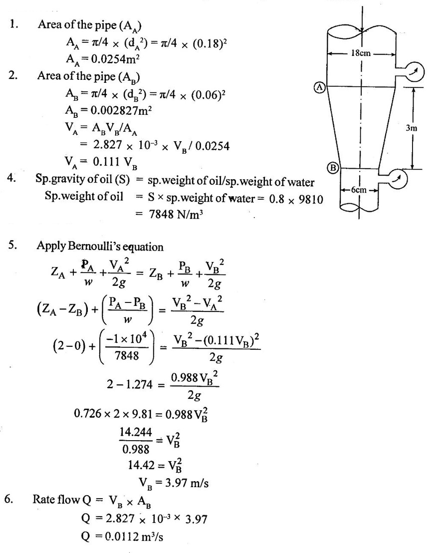 SOLVED EXAMPLES BASED ON INCLINED VENTURIMETER Example - 78 Find the discharge of water through a pipe of 40cm diameter placed in an inclined position where a venturimeter is inserted, having a throat diameter of 20cm. The difference of pressure between the main and throat is measured by a liquid of specific gravity 0.7, in an inverted U-tube which gives a reading of 20cm. The loss of head between the main and throat is 0.4 times the kinetic head of the pipe. Given data: Pipe diameter (d1) = 40cm = 0.4m Throat diameter (d2) = 20cm = 0.2m Specific gravity of oil (S) = 0.7 Manometer reading (x) = 20cm = 0.2m Loss of head (hL) = 0.4 X Kinetic head of the pipe( V1)2/2g To find: Rate of flow of water (Q) Solution: Result : Discharge(Q) = 0.0346 m3/s Example - 79 In vertical pipe conveying oil of specific gravity 0.8 to pressure gauge have been installed at A and B where the diameter are 18 cm and 6 cm respectively A is 2m above B. The pressure gauge readings have shown that the pressure of B is greatest than A by -1 N/cm2. Neglecting all losses. Calculate the flow rate if the gauge at A and B are replaced by tubes filled with the same liquid and connected to a U tube containing mercury. Calculate the difference of level of mercury in the two limbs of the tube. Given data: Specific gravity of oil (So) = 0.8 Diameter of the pipe at point A (dA) = 18cm = 0.18m Diameter of the pipe at point B (dB) = 6cm = 0.06m Datum head at point A (ZA) = 2m Datum head at point B (ZB) = 0 Difference of pressure (PB - PA) = -1 × 104 N/m2 To find: (1) Rate of flow while using pressure gauge (2) Difference of level of mercury while using U tube manometer Solution: 7. Difference level of mercury in the U-tube (i) Rate of flow while using pressure gauge (Q) = 0.0112 m3/s. (ii) Difference of mercury level (x) = 0.04536 m Example - 80 A 30 × 15cm Venturimeter is provided in a vertical pipe line carrying oil of specific gravity 0.6, the flow being upwards. The difference in elevation of the throat section and entrance section of the Venturimeter is 40cm. The differential U-tube mercury manometer shows a gauge deflection of 25cm. Calculate (i) The discharge of oil. (ii) The pressure difference between the entrance section and throat section. Take co-efficient of discharge as 0.98. Given data: Pipe diameter (d1) = 30 cm = 0.3 m Throat diameter (d2) = 15 cm = 0.15 m Specific gravity of oil (So) = 0.6 Difference of datum head (Z2 - Z1) = 40 cm = 0.4 m Differential manometer reading (x)= 25 cm = 0.25 m Co-efficient of discharge (Cd) = 0.98 To find: 1. Discharge of oil (Q) 2. Pressure difference between two sections (P1 – P2) Solution: h = (P1/w - P2/w) + (Z1 − Z2) h = (P1 - P2/w) + (−0.40) (P1 - P2/w) = h + 0.40 = 5.416 + 0.40 (P1 – P2/2/w ) = 5.816 (P1 - P2) = 5.816 × w Specific weight of oil = specific gravity of oil × specific weight of water = 0.6 × 9810 w = 5886 N/m3 P1 – P2 = 5.816 × 5886 = 34232.976 N/m2 P1 - P2 = 34.232 KN/m2 Result : (i) Discharge Q = 0.1844 m3/s (ii) Pressure difference P1 - P2 = 34.232 KN/m2 Example - 81 The oil of specific gravity 0.85 flows upwards of a volume rate of flow of 50 litre per second through a vertical venturimeter with an inlet diameter of 300mm and a throat diameter of 200mm. The co-efficient of discharge of venturimeter is 0.90. The vertical distance between pressure tapping is 200mm. Determine the difference of readings of the two pressure gauges. And also determine the manometer reading when replacing the U-tube manometer instead of pressure gauge in the pipe. Given data: Specific gravity of oil (So) = 0.85 Rate of flow (Q) = 50 litres = 0.05m3/s Inlet diameter (d1) = 300 mm = 0.3m Throat diameter (d2) = 200 mm = 0.2m Co-efficient of discharge (Cd) = 0.90 Difference in datum head (Z2 – Z1) = 200mm = 0.2m To find: (i) Pressure difference (P1 - P2) (ii) Manometer reading (x) Solution: 4. Venturimeter head (h) = (P1/w + Z1) - (P2/w + Z2) Specific weight of oil (w) = specific gravity of oil × specific weight of water = 0.85 × 9810 w = 8338.5 N/m3 h = (P1/w - P2/w) + (Z1 − Z2) h = (P1 - P2/w) + (-0.2) (P1 − P2) = (h × w) − 0.2 = 0.1280 × 8338.5 − 0.2 (P1 - P2) = 1067.19 N/m2 Result: (i) Pressure difference (P1 - P2) = 1067.19 N/m2 (ii) Monometer Reading (x) = 8.53 × 10-3 mResult :