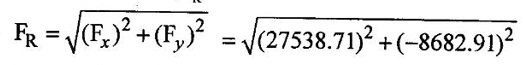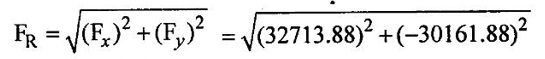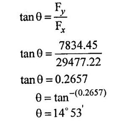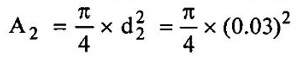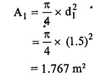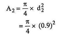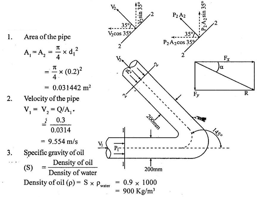 SOLVED EXAMPLES BASED ON MOMENTUM EQUATION Example - 86 A 50° reducing bend is connected in a pipeline, the diameters at the inlet and outlet of the bend being 700mm and 350mm respectively. Find the force exerted by the water on the bend if the intensity of pressure at inlet to bend is 9.2N/cm2 and rate of flow of water is 500 lits/sec. Also find the angle made by the resultant force with horizontal direction. Given data: Angle of bend (θ) = 50° Inlet diameter (d1) = 700mm = 0.7m Outlet diameter (d2) = 350mm = 0.35m Intensity of pressure at inlet (P1) = 9.2N/cm2 = 9.2 × 104 N/m2 Rate of flow (Q) = 500 lits/sec = 0.5m3/sec To find: 1. Resultant force (FR) 2. Angle made by the resultant force with horizontal direction. Solution: 5. Net force acting in x-direction Fx = ρQ(V1 - V2 cosθ) + P1 × A1 - P2 × A2 cosθ Fx = 1000 × 0.5(1.299-5.197 cos 50) + 9.2 × 104 × 0.3848 - 7.93 × 104 × 0.0962 cos 50 Fx = 500 × (−2.04156) + 35.4016 × 103 – 4903.60 Fx = -1020.78 + 35.4016 × 103 - 4903.60 Fx = 29477.22 Fx = 29.477 kN 6. Net force acting in y-direction Fy = ρQ (-V2y sinθ) – P2yA2 sinθ Fy = 1000 × 0.5(-5.197 × sin 50) - 7.93 × 104 × 0.0962 sin 50 Fy = -1990.56 - 5843.89 Fy = -7834.45N 7. Resultant force (FR) FR = 30500.57Ņ 8. Angle made by Resultant force Result : (i) Resultant force (FR) = 30500.57 N (ii) Angle made by Resultant force (θ) = 14°53' Example - 87 300 lit/sec of oil flowing through a pipe having a diameter of 200mm. If the pipe is bent by 145o (that is changed from initial to final direction is 145o), find the magnitude and direction of the resultant force on the bend. The pressure of oil flowing is 40N/cm2 and specific gravity of oil is 0.9. Given data: Diameter of pipe d1 = d2 = 200mm = 0.2m Rate of flow Q = 300 lits/sec = 0.3 m/sec Angle of bend θ = 180-145=35° Pressure of the pipe P1 = P2 = 40N/cm2 = 40 × 104N/m2 Specific gravity of oil (S) = 0.9 To find: Resultant force Solution: 4. Net force in x-direction Fx = ρQ(V1x - V2 cosθ) + P1xA1 + P2x A2 cosθ V2 Applied in opposite direction so -ve sign and P2 in same direction so + sign Fx = ρQ(V1x - (-V2 cosθ) + P1xA1 + P2x A2 cosθ Fx = ρQ(V1x + V2 cosθ) + P1xA1 + P2x A2 cosθ Fx = 900 × 0.3(9.549 + 9.549 cos 35) + 40 × 104 × 0.0314 + 40 × 104 × 0.0314 × cos35 = 270 × 17.3710 + 12560 + 10288.54 = 4690.17 +12560 + 10288.54 = 27538.71 N 5. Net force acting in y-direction Fy = ρQ(−V2y sinθ) – P2y A2 sinθ Fy = 900 × 0.3(−9.549 × sin 35) - 40 × 104 × 0.0314 × sin35 = 270 × (-5.477) - 7204.12 = - 8682.91 N 6. Resultant Force (FR) FR = 28,875.14N Result : Resultant Force (FR) = 28,875.14N Example - 88 A pipe of 400mm diameter conveying 0.4m3/s of water has a right angled bend in a horizontal plane. Find the resultant force exerted on the bend if the pressure at inlet and outlet of the bend are 25N/cm2 and 23N/cm2 Given data: Angle of bend (θ) = 90° Pipe diameter d1 = d2 = 400mm = 0.4m Discharge (Q) = 0.4m3/s Inlet pressure (P1) = 25N/cm2 = 25 × 104 N/m2 Outlet pressure (P2) = 23N/cm223 × 104N/m2 To find: Resultant force (FR) Solution: 3. Net force in x-direction Fx = ρQ(V1x - V2 cosθ) + P1x A1 + P2x A2 cosθ V2 Applied in same direction so + ve sign and P2 in opposite direction so-ve sign Fx = ρQ(V1x - V2 cosθ) + P1x A1 + P2x A2 cosθ Fx = 1000 × 0.40(3.2847-(+ 3.2847 cos 90) + 25 × 104 × 0.1256 -23 × 104 × 0.1256 × cos 90 Fx = 1000 × 0.40(3.2847-0) + 25 × 104 × 0.1256 - 0 = 1313.88 + 31400 Fx = 32713.88 N 4. Net force in y-direction Fy = ρQ(-V2y sinθ) - P2y A2 sinθ Fy = 1000 × 0.4 (-3.1847 × sin 90°) - 23 × 104 × 0.1256 × sin 90 = 400 × (-3.1847) - 28888 Fy = -30161.88N 5. Resultant Force (FR) FR = 44496.48 N Result : Resultant Force (FR) = 44496.48 N Example - 89 A nozzle of diameter 30mm is fitted to a pipe of diameter 50mm. Find the force exerted by the nozzle on the water which flowing through the pipe at the rate of 2.3m3/min. Given data: Pipe diameter d1 = 50mm = 0.05m Nozzle diameter d2 = 30mm = 0.03m Rate of flow (Q) = 2.3m3/min = 0.0383m3/s To find: Force exerted by nozzle Solution: = 0.0007068 m2 3. Discharge (Q) Q = A1V1 = A2V2 V1 = Q/A1 = 0.0383 / 0.001963 = 19.510 m/s V2 = Q/A2 = 0.0383/0.0007068 = 54.187 m/s P1 = 9810 × 130.254 P1 = 1277791.74 N/ m2 4. Force exerted by nozzle Net force in x-direction = Rate of change of momentum P1A1 - P2A2 + Fx = ρ Q (V2 − V1) Fx = ρQ (V2 - V1) − P1A1 − P2A2 = 1000 × 0.0383 (54.187 - 19.510) - 1277791.74 × 0.001963 – 0 × 0.0007068 = 1328.129 - 2508.305 Fx = -1180.18 N Result : Force exerted by nozzle Fx = -1180.18 N Example - 90 The diameter of a pipe gradually reduces from 1.5m to 0.9m and the pressure intensity is 8KN/m2 at inlet. The rate of flow of water through the pipe is 500lit/sec. Find the intensity of pressure at the outlet and also determines the force exerted by flowing water on the transition of the pipe. Given data: Diameter at inlet (d1) = 1.5m Diameter at inlet (d2) = 0.9m Intensity of pressure at inlet (P1) = 8KN/m2 = 8 × 103 N/m2 The rate of flow (Q) = 500lit/s = 0.5m3/s To find: 1. Intensity of pressure at the outlet (P2) 2. Force exerted by flowing water on the transition of the pipe (Fx) Solution: 1. Area of the pipe at inlet (A1) 2. Area of the pipe at outlet (A2) = 0.636 m2 3. Discharge (Q) Q = A1V1 = = A2V2 V1 = Q/A1 = 0.5/1.767 = 0.282m/s V2 = Q/A2 = 0.5/0.636 = 0.786 m/s 4. Force exerted by flowing water on the transition of the pipe (Fx) Net force in x- direction = Rate of change of momentum P1A1 – P2A2 + Fx = ρ Q (V2 − V1) Fx = ρ Q (V2 − V1) - P1A1 – P2A2 = 1000 × 0.5(0.786-0.282) - 8 × 103 × 1.767 + 7726.356 × 0.636 = 252 – 14136 + 4913.96 Fx = -8970.04 N Force exerted by flowing water on the transition of the pipe = - Fx = -(-8970.04) = 8970.04 N Result : Force exerted by flowing water on the transition of the pipe (Fx) = 8970.04 N2. Area of the pipe at outlet (A2)