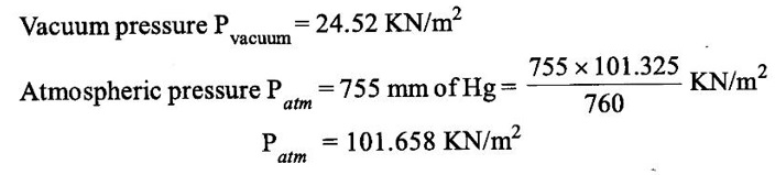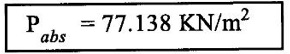 SOLVED PROBLEM ON PRESSURE MEASUREMENT Example - 47 Express the pressure intensity of 0.7356 N/mm2 gauge absolute pressure in (i) KN/m2 of and (ii) in m of water. Given data: Gauge pressure = 0.7356 N/mm2 = 0.7356 × 106 N/m2. Solution: Case (i) in KN/m2 Absolute pressure = Atmosphere pressure + Gauge pressure W.K.T Atmospheric pressure = 1.014 × 105 N/mm2 Absolute pressure = 1.014 × 105 + 0.7356 × 106 = 8.37 × 105 N/m2 = 837 KN/m2 Absolute pressure = 837 KN/m2. Case (ii) In m of water Gauge pressure = 0.7356 × 106 N/m2 Gauge pressure = 0.7356 × 106 / 9810 = 74.985 m of water W.K.T Atmospheric pressure = 10.33 m of water Absolute pressure = atmospheric pressure + gauge pressure = 10.33 + 74.985 = 85.315 m of water Absolute pressure = 85.315 m of water. Result: Case (i) Absolute pressure = 837 KN/m2 Case (ii) Absolute pressure = 85.315 m of water. Example - 48 A gauge records a pressure of 24.52 KN/m2 in vacuum. Compute the corresponding absolute pressure in (a) KN/m2. (b) m of water. The local atmospheric pressure is 0.75 m of mercury; specific gravity of mercury is 13.6. Given data: Vacuum pressure = 24.52 KN/m2 Atmospheric pressure = 0.75 m of mercury Solution: case (i) in KN/m2 Atmospheric pressure = 0.75 m of mercury = (13.6 × 9810) × 0.75 (p = WH) = 100062 N/m2 = 100.062 KN/m2. Absolute pressure = atmospheric pressure - vacuum pressure = 100.062 - 24.52 = 75.542 KN/m2 Absolute pressure = 75.542 KN/m2 case (ii) In m of water Atmospheric pressure = 0.75 m of mercury = 13.6 × 0.75 '= 10.2 m of water Vacuum pressure = 24.52 KN/m2 = 24.52 × 103 N/m2 = 2.4995 m of water. Absolute pressure = Atmospheric pressure - Vaccum pressure = 10.2 - 2.4995 = 7.7 m of water. Absolute pressure = 7.7 m of water Result: Case (i) Absolute pressure = 75.542 KN/m2 Case (ii) Absolute pressure = 7.7 m of water Example - 49 What is the gauge pressure in mm of mercury when the pressure at a point is (a) 85 absolute (b) 18 m of water absolute? Given data: Absolute pressure = 85 KN/m2 = 85 × 103 N/m2 Specific weight of mercury = 13.6 × 9810 N/m2 Solution: = 0.637 m of Hg = 637.10 mm of Hg Case (i) Atmospheric pressure = 760 mm Hg But absolute pressure = atmospheric pressure + gauge pressure Gauge pressure = absolute pressure - atmospheric pressure = 637.10 - 760 = -122.9 mm of Hg Case (ii) Absolute pressure = 18 m of water = 1323.53 mm of Hg Gauge pressure = Absolute pressure - atmospheric pressure = 1323.53 - 760 Result: Case (i) Gauge pressure = 122.9 mm of Hg vacuum Case (ii) Gauge pressure = 563.5 mm of Hg Example - 50 Pressure Indicated by a column of water is 8.75 m what is the absolute pressure KN/m2. Take atmospheric pressure as 101.325 KPa. Given data: Water column H = 8.75 m Absolute pressure Pabs = ? Atmospheric pressure Patm = 101.325 KPa = 101.325 KN/m2 Solution: Pabs = Patm + Pgauge P = hw Gauge pressure = 8.75 × 9810 N/m2 = 85837.5 N/m2 = 85.837 KN/m2 Result: Gauge pressure = 85.837 KN/m2. Example - 51 A gauge is fitted to a cylinder records a pressure of 24.52 KN/m2 vacuum compute the corresponding absolute pressure in (i) KN/m2 (ii) m of water. The local atmospheric pressure is 755 mm of Hg. Given data: Solution: Case (i) Absolute pressure in KN/m2 Pabs = Patm + Pgauge = 101.658 - 24.52 Case (ii) Absolute pressure in m of water Result: Case (i) Absolute pressure = 77.138 KN/m2 Case (ii) Absolute pressure = 7.863 m of water