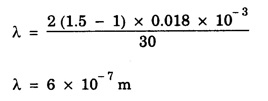When a thin film of glass of refractive index 1.5 is interposed in the path of one of the interfering beams of the Michelson interferometer, a shift of 30 fringes of sodium light is observed to cross the field of view. If the thickness of the air film is 0.018 mm, calculate the wavelength of the light used.