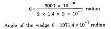 Light of wavelength 6000 Å falls normally on a thin wedge shaped film of refractive index u = 1.4 forming fringes that are 2 mm apart. Find the angle of the wedge?