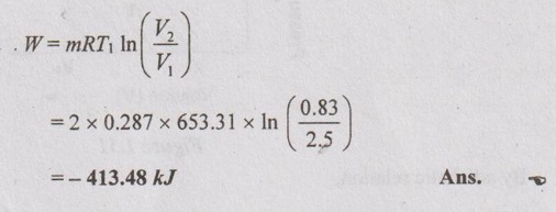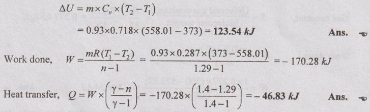 SOLVED PROBLEMS ON CLOSED SYSTEMS (NON-FLOW PROCESSES) Problem 1.12 Mass of 15 kg of air in a piston cylinder device is heated from 25°C to 90°C by passing current through a resistance heater inside the cylinder. The pressure inside the cylinder is held constant at 300 kPa during the process and a heat loss of 60 kJ occurs. Determine the electrical energy supplied in kW-hr and change in internal energy.- Given data: m = 15 kg T1 = 25°C = 25 + 273 = 298 K T2 = 90°C = 90 + 273 = 363 K p1 = p2 = 300 kPa = 300 kN/m2 Q = -60 kJ To find: (i) Electrical energy supplied (ii) Change in internal energy Solution: Work done, W = mR (T2 - T1) = 15x0.287 (363-298) = 279.825 kJ Electrical energy supplied = Work done in kW-hr = Work done x 3600 = 279.825 × 3600=1007.37 x 103 kW-hr Ans. Change in internal energy, AU=Q-W=-60-279.825 =-339.825 kJ Ans. Problem 1.13 In a vessel 10 kg of O2 is heated in a reversible non-flow constant volume process so that the pressure of O2 is increased two times that of initial value. The initial temperature is 20°C. Calculate the final temperature, change in internal energy, change in enthalpy and heat transfer. Take R = 0.259 kJ/kg K and Cv = 0.625 kJ/kg K for oxygen. Given data: m = 10 kg Process: Constant volume process p2 = 2p1 T1 = 20°C = 20 + 273 = 293 K R = Cp - Cv = 0.259 kJ/kg K So, Cp = R + Cv = 0.259 + 0.652 = 0.911 kJ/kg K To find: T2, ΔU, ΔH and Q Solution: (a) Temperature at the end of the process (T2): (b) Change in internal energy: ΔU = m × Cv × (T2 – T1) = 10 × 0.652 × (586 - 293) = 1910.36 kJ Ans. (c) Change in enthalpy: ΔH = m × Cp × (T2 – T1) = 10 × 0.911 × (586 - 293) = 2669.23 kJ Ans. By first law of thermodynamics, Q = W + ΔU For constant volume process, W = 0 ⸫ Q = ΔU = 1910.36 kJ Ans. Problem 1.14 A certain gas of volume 0.4 m3, pressure of 4.5 bar and temperature of 130°C is heated in a cylinder to 9 bar when the volume remains constant. Calculate the (i) temperature at the end of the process, (ii) the heat transfer, (iii) change in internal energy (iv) work done by the gas, (v) change in enthalpy and (vi) mass of the gas. Assume Cp = 1.005 kJ/kgK and Cv = 0.71 kJ/kgK. Given data: V1 = 0.4 m3 p1 = 4.5 bar = 450 kN/m2 T1 = 130°C = 130 +273 = 403 K p2 = 9 bar = 900 kN/m2 Cp = 1.005 kJ/kg K Cv = 0.71 kJ/kg K and Process: Constant volume process To find: T2, Q, ΔU, W, ΔH and m Solution: (a) Temperature at the end of the process (T2): Relation between p, V and T for constant volume process is given by (b) Heat transfer (Q): Q = mCv (T2 - T1) First, the mass of the gas is found by using characteristic gas equation p1V1 = mRT1 where R = Cp - Cv = 1.005 - 0.71 = 0.295 kJ/kgK Then, Q = 1.51 × 0.71 × (806 - 403) = 432.06 kJ Ans. (c) Change in internal energy, (ΔU): From first law, Q = W + ΔU In this process, W = 0 Therefore, ΔU = Q = 433.2 kJ Ans. (d) Work done by the gas (W): For constant volume process, work done by the gas is zero. W = 0 Ans. (e) Change in enthalpy (H): Enthalpy, ΔH = mCv (T2 - T1) = 1.51 × 0.71 (806 - 403) = 432.06 kJ Ans. (f) Mass of the gas (m): Mass, m = 1.51 kg Ans. Problem 1.15 5 kg of air at 40°C and 1 bar is heated in a reversible non-flow constant pressure until the volume is doubled. Find the (a) change in volume, (b) work done, (c) change in internal energy and (d) change in enthalpy. Given data: m = 5 kg T1 = 40°C = 40 + 273 = 313 K p1 = 1 bar = 100 kN/m2 V2 = 2V1 Process: Constant pressure process To find: V2 - V1, W, ΔU and ΔH Solution: From ideal gas equation, p1V1 = mRT1 ⸫ Final volume, V2 = 2V1 = 2 × 4.49 = 8.98 m3 (i) Change in volume: V2 - V1 = 8.98 - 4.49 = 4.49 m3 Ans. (ii) Work transfer: = p (V2 - V1) = 100 (8.98 - 4.49) = 449 kJ Ans. (iii) Change in internal energy: ΔU = mCv (T2 - T1) For constant pressure process, ⸫ ΔU = 5 × 0.714 (626 - 313) = 1117.41 kJ Ans. (iv) Change in enthalpy: ΔH = mCp (T2 - T1) = 5 × 1.005 (626 - 313) = 1572.83 kJ Ans. Problem 1.16 One kg of gas expands at constant pressure from 0.085 m3 to 0.13 m3. If the initial temperature of the gas is 225°C, find the final temperature, net heat transfer, change in internal energy and pressure of gas. Given data: Process: Constant pressure process m = 1 kg V1 = 0.085 m3 V2 = 0.13 m3 T1 = 225°C = 225 + 273 = 498 K Assume Cp = 1.005 kJ/kg K; Cv = 0.718 kJ/kg K To find: T2, Q, ΔU and p Solution: (i) Final temperature (T2): By using p, V and T relation for constant pressure process, (ii) Heat transfer (Q): Q = mCp (T2 - T1) = 1 × 1.005 (761.65 - 498) = 264.97 kJ Ans. (iii) Change in internal energy (ΔU): ΔU = mCv (T2 – T1) = 1 × 0.718 (761.65 - 498) = 189.3 kJ Ans. (iv) Pressure (p): p1V1 = mRT1 p1 = 1681.48 kN/m2 = p2 Ans. Problem 1.17 0.25 kg of air at a pressure of 1 bar occupies a volume of 0.3 m3. If this air expands isothermally to a volume of 0.9 m3, find the (i) initial temperature, (ii) final temperature (iii) external work done, (iv) heat absorbed by the air and (v) change in internal energy. Assume R = 0.287 kJ/kgK. Given data: m = 0.25 kg p1 = 1 bar = 100 kN/m2 V1 = 0.3 m3 V2 = 0.9 m3 Process: Isothermal or constant temperature process To find: T1, T2, W, Q and ΔU Solution: From ideal gas equation, p1V1 = mRT1 Problem 1.18 A mass of 1.5 kg of air is compressed in a quasi-static process from 0.1 MPa to 0.7 MPa for which pV = constant. The initial density of air is 1.16 kg/m3. Find the work done by the piston to compress the air. Given data: m = 1.5 kg Process = quasi-static, pV= C (Isothermal) p1 = 0.1 MPa = 100 kN/m2 p2 = 0.7 MPa = 700 kN/m2 Initial density, ρ1 = 1.16 kg/m3 To find: Work done, W Solution: Work done for isothermal process, = -251.62 kJ Ans. (Negative sign indicates that the work is done on the system) Problem 1.19 2 kg of gas at a pressure of 1.5 bar occupies a volume of 2.5 m3. If this gas is isothermally compressed to 1/3 times the initial volume, find the (i) initial temperature (ii) final temperature (iii) work done and (iv) heat transfer. Assume R = 0.287 kJ/kg