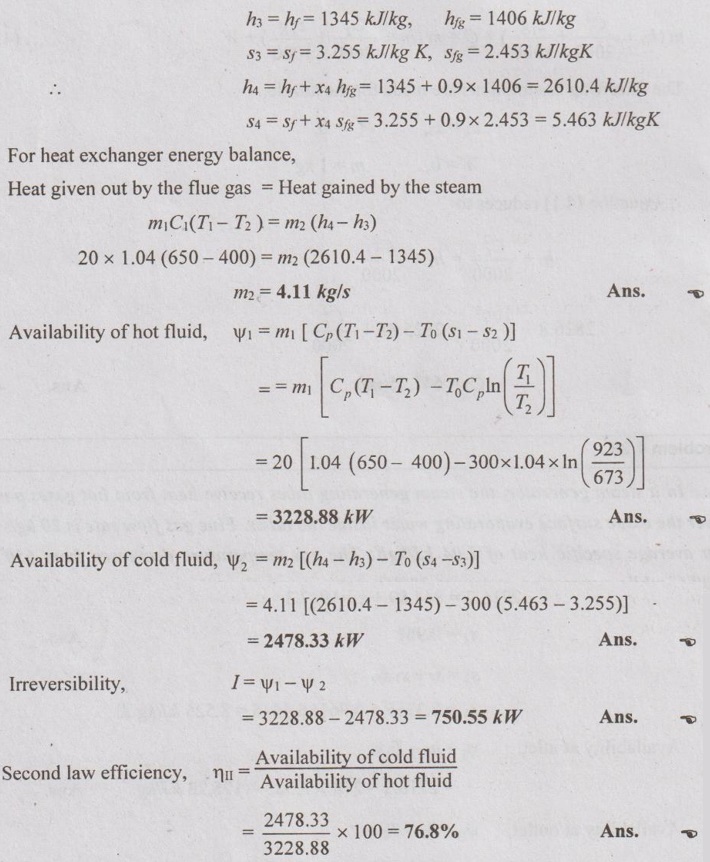 SOLVED PROBLEMS ON FLOW PROCESSES Problem 4.24 A boiler generates steam at 3 bar and 0.85 dry from water at 45°C; 540 kJ/s heat is added during the evaporation. Calculate the amount of steam generated per hour. Given data: p = 3 bar = 300 kPa x = 0.85 Tw = 45°C Heat added = 540 kJ/s To find: Steam generated per hour Solution: From saturated water table of pressure scale, corresponding to 3 bar, Problem 4.25 Steam enters an adiabatic turbine at 10 MPa and 500°C at the rate of 3 kg/s and leaves at 50 kPa. If the power output of turbine is 2 MW, determine the velocity of steam at exit of turbine. Given data: p1 = 10 MPa = 100 bar T1 = 500°C m = 3 kg/s p2 = 50 kPa = 0.5 bar W = 2 MW = 2000 kW To find: C2 Solution: From superheated enthalpy and superheated entropy tables, corresponding to 100 bar and 500°C, h1 = 3374.6 kJ/kg s1 = 6.599 kJ/kg K In adiabatic process, entropy remains constant, s1 = s2 ⸫ s2 = 6.599 kJ/kg K From saturated water table of pressure scale, corresponding to 0.5 bar, Problem 4.26 150 kg/s of steam at 25 bar and 300°C expands isentropically in a steam turbine to 0.33 bar. Determine the power output of the turbine. Given data: m = 150 kg/s p1 = 25 bar = 2500 kPa T1 = 300°C p2 = 0.33 bar = 33 kPa To find: W Solution: From superheated enthalpy and superheated entropy tables, corresponding to 25 bar and 300°C, h1 = 3010.4 kJ/kg s1 = 6.648 kJ/kgK For isentropic process, s1 = s2 ⸫ s2 = 6.648 kJ/kg K From saturated water table of pressure scale, corresponding to 0.33 bar, hf2 = 298.6 kJ/kg, sf2 = 0.971 kJ/kg K, hfg2 = 2330.6 kJ/kg, s fg2 = 6.766 kJ/kg K s2 = sf2 +x2 sfg2 From saturated water table of pressure scale, corresponding to 0.33 bar, 6.648 = 0.971 + x2 × 6.766 x2 = 0.839 h2 = hf2 + x2 hfg2 = 298.6 + 0.839 × 2330.6 = 2253.97 kJ/kg Turbine work, W = m (h1 - h2) = 150 (3010.4 - 2253.97) = 113464.5 kW = 113.47 MW Ans. Problem 4.27 A nozzle is supplied with steam of 1 MPa at 200°C with a velocity of 100 m/s. The expansion takes place to a pressure of 300 kPa. Assuming isentropic efficiency of nozzle to be 90%, find the final velocity. Given data: p1 = 1 MPa = 10 bar = 1000 kPa T1 = 200°C C1 = 100 m/s p2 = 300 kPa = 3 bar ηisentropic = 90% To find: C2 Solution: From saturated water table of pressure scale, corresponding to 10 bar, Tsat = 179.9°C Since T1 > Tsat, the state would be in the superheated region. From superheated enthalpy and superheated entropy tables, at 10 bar and 200°C, h1 = 2826.8 kJ/kg s2 = 6.692 kJ/kgK, From saturated water table of pressure scale, corresponding to 3 bar, hf2 = 561.5 kJ/kg, hfg2 = 2163.2 kJ/kg sf2 = 1.672 kJ/kgK, sfg2 = 5.319 kJ/kgK s2s = sf2 + x2 sfg2 s1= s2s = 6.692 kJ/kgK ⸫ 6.692 = 1.672 + x2s × 5.319 x2s = 0.944 ⸫ h2s = hf2 + x2s hfg2 = 561.5 + 0.944 × 2163.2 = 2603.56 kJ/kg Problem 4.28 In a steam generator, the steam generating tubes receive heat from hot gases passing over the oxide surface evaporating water inside the tubes. Flue gas flow rate is 20 kg/s with an average specific heat of 1.04 kJ/kgK. The gas temperature decreases from 650°C to 400°C while generating steam at 300°C water enters the tube as a saturated liquid and leaves with a quality of 90%. Assume environment temperature as To = 27°C. Determine the water flow rate, availability of hot fluid and cold fluid, irreversibility and second law efficiency. Given data: m1 = 20 kg/s C1 = 1.04 kJ/kg K T1 = 650°C = 650 + 273 = 923 K T2 = 400°C 400 + 273 = 673 K T3 = 300°C (Saturated liquid) x4 = 0.9 To = 27°C = 27 + 273 = 300 K To find: m2, ψ1, ψ2, I and ηII Solution: From saturated steam table, corresponding to 300°C, Problem 4.29 Steam flows in a pipeline at 1.5 MPa. After expanding to 0.1 MPa in a throttling calorimeter, the temperature is found to be 120°C. Find the quality of steam in the pipeline and also calculate availabilities, irreversibility and second law efficiency. Assume To = 25°C. Given data: p1 =1.5 MPa = 15 bar p2 = 0.1 MPa = 1 bar T2 = 120°C = 120 + 273 = 393 K To = 25°C = 25 + 273 = 298 K To find: x1, ψ1, ψ2, I and ηII Solution: From the superheated steam table, corresponding to p2 = 1 bar and T2 = 120°C, h2 = 2716.2 kJ/kg s2 = 7.4606 kJ/kgK For throttling process, h1 = h2 = 2716.2 kJ/kg But at p1 = 15 bar, h1 = 844.89 kJ/kg; sf = 2.3315 kJ/kgK; hfg = 1947.3 kJ/kg sfg = 6.4448 kJ/kgK h1 = hf + x1 hfg 2716.2 = 844.89 + x1 × 1947.31. Solved Problem on Boiler