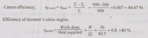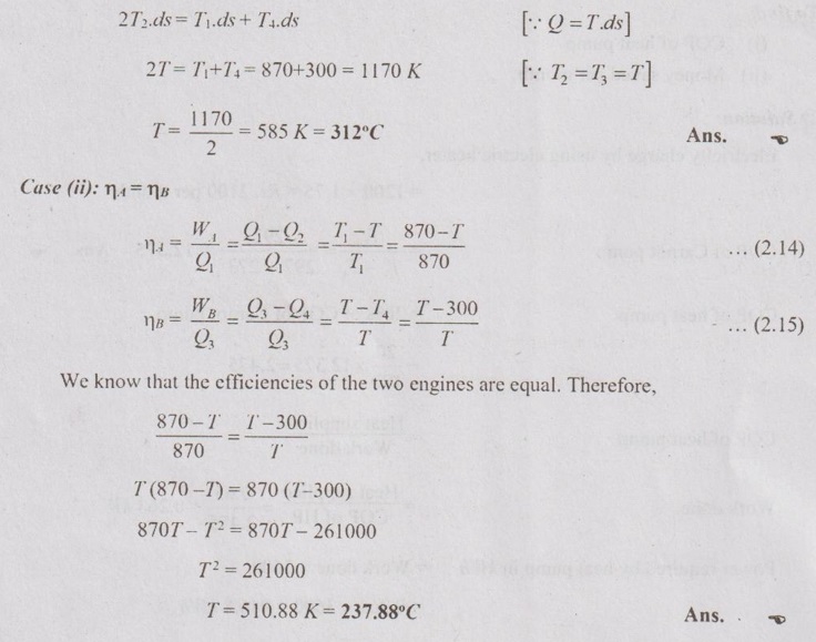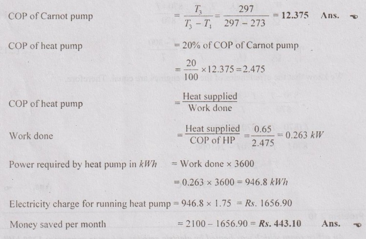 SOLVED PROBLEMS ON HEAT ENGINES, REFRIGERATORS AND HEAT PUMP Problem 2.1 An inventor claims to have developed an efficient heat engine which would have a heat source at 1000°C and reject heat to a sink at 50°C and gives an efficiency of 90%. Justify whether his claim is possible or not. Given data: T1 = 1000°C = 1000 + 273 = 1273 K T2 = 50°C = 50 + 273 = 323 K η = 90% To find: Whether the inventor's claim is correct or not. Solution: According to Carnot theorem, the reversible engine gives maximum efficiency than all other heat engines. Maximum efficiency (74.63%) is less than the proposed engine efficiency (90%). Therefore, the inventor's claim is impossible. Ans. Problem 2.2 An inventor claims that his proposed engine has the following specification: Power developed = 50 kW Fuel burnt = 3 kg/hr Calorific value of the fuel = 75000 kJ/kg Temperature limits = 27°C and 627°C Find out whether it is possible or not. Given data: W = 50 kW Fuel burnt = 3 kg/hr Calorific value (CV) of fuel = 75,000 kJ/kg Temperature limits, T2 = 27°C = 27 + 273 = 300 K T1 = 627°C = 627 + 273 = 900 K To find: Whether the inventor's claim is possible or not. Solution: Heat supplied to the engine, Q1 = Fuel burnt × CV = 3 × 75000 = 225000 kJ/hr Q1= 62.5 kJ/s = 62.5 kW Work done, W = 50 kW From Carnot theorem, Carnot engine gives maximum efficiency than any other engine. Here the inventor's claim engine has the higher efficiency than maximum engine efficiency which is impossible. Ans. Problem 2.3 Determine whether the following cases represent the reversible, irreversible or impossible heat engines: (i) 900 kW of heat rejected (ii) 560 kW of heat rejected (iii) 108 kW of heat rejected In each case the engine is supplied with 1120 kJ/s of heat. The source and sink temperature are maintained at 560 K and 280 K. Given data: T1 = 560 K T2 = 280 K Q1 = 1120 kJ/s (i) Q2 = 900 kW (ii) Q2 = 560 kW (iii) Q2 = 108 kW To find: Conclude the above cases are reversible, irreversible and impossible heat engines. Solution: From Carnot theorem, the Carnot engine gives maximum efficiency than any other engine. Maximum efficiency or Carnot efficiency, But, engine C directly rejects heat to the low temperature reservoir, T4. The intermediate temperature between engine A and B is T2 = T3 = T. Applying the above equation (2.3) for all three engines A, B and C respectively, pppppp So, the equation can be rewritten by using equations (2.5) and (2.6) as follows, pppppp The above equation (2.9) is a function of T1 and T4 only and it is independent of T on left hand side. The right hand side is also a function of T1 and T4 but it is not independent of T. The product of T gets cancelled. After it has been cancelled, the term f (T1, T) can be written as ϕ(T1)/ϕ(T) and the term ƒ (T, T4) can be written as ϕ(T)/ϕ( T4), where ϕ is another unknown function. pppp This obeys Kelvin-Planck statement of second law of thermodynamics. So, it can be written as ϕ(T) = T. Then the above equation becomes pppp This temperature scale is known as Kelvin scale. The temperature measured on this scale is known as absolute temperature. The temperature scale is not completely defined. At International Conference on Weights and Measures (1954), the triple-point of water was assigned as the value of 273.16 K. The magnitude of a Kelvin is defined as 1/273.16 of the temperature interval between absolute zero and triple- point temperature of water. The magnitudes of temperature units on the Kelvin and Celsius scales are identical (1 K = 1°C). The temperatures on these two scales differ by a constant 273.16. T(°C) = T(K) - 273.16 Therefore, it is reversible heat engine because by II law all the reversible engines have same efficiency. Ans. Problem 2.4 A heat engine of 30% efficiency drives a heat pump of COP = 5. The heat is transferred both from engine and heat pump to the circulating water for heating the building in winter. Find the ratio of heat transfer to the circulating water from the heat pump to the heat transfer to the circulating water from the heat engine. Given data: ηHE 30% COP of HP = 5 To find: Q4/Q1 where Q4 - Heat transfer to the circulating water from heat pump Q1 - Heat transfer to the circulating water from heat engine. Solution: For heat engine: For heat pump: Problem 2.5 A reversible heat engine operating between reservoirs at 900 K and 300 K drives a reversible refrigerator operating between reservoirs at 300 K and 250 K. The heat engine receives 1800 kJ heat from 900 K reservoir. The net output from the combined engine refrigerator is 360 kJ. Find the heat transferred to the refrigerator and net heat rejected to the reservoir at 300 K. Given data: T1 = 900 K T2 = 300 K T4 = 250 K T3 = 300 K Q1 = 1800 kJ W1 - W2 = 360 kJ To Find: Q4 and Q2 + Q3 Solution: Maximum efficiency of heat engine, We know that W2 = Q3 - Q4 840.06 = Q3 - 4200.3 ⸫ Q3 = 840.06 + 4200.3 = 5040.36 kJ ⸫ Net heat transferred to the reservoir at 300 K, = Q2 + Q3 = 599.94 + 5040.36 = 5640.3 kJ Ans. Problem 2.6 A Carnot heat engine cycle works at maximum and minimum temperature of 1000°C and 40°C respectively. Calculate the thermal efficiency and work done if Q1= 1010 kJ. Given data: T1 = 1000°C = 1000 + 273 = 1273 K T2 = 40°C = 40 + 273 = 313 K Q1 = 1010 kJ To find: η and W Solution: Problem 2.7 A Carnot heat engine receives heat from 600°C source. The efficiency of the engine is 59%. Find the amount of heat supplied and heat rejected per kW of work output. Given data: T1 = 600°C = 600 + 273 = 873 K η = 59% W = 1 kW To find: Q1 and Q2 Solution: Problem 2.8 The temperature in a domestic refrigerator is to be maintained at -10°C. The ambient air temperature is 30°C. If the heat leaving through the refrigerator is 3 kW, determine the least power necessary to pump out this heat continuously. Given data: T4 = -10°C = -10 + 273 = 263 K T3 = 30°C = 30 + 273 = 303 K Q3 = 3 kW To find: Power (W) Solution: A refrigerator removes heat at the same rate at w