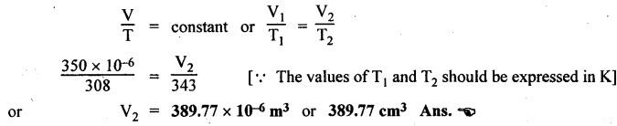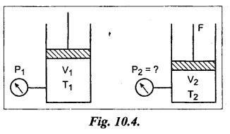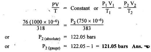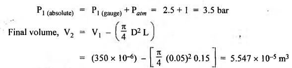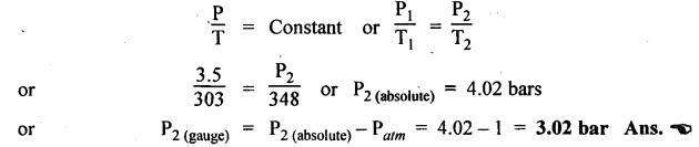 SOME NUMERICAL EXAMPLES ILLUSTRATING PERFECT GAS LAWS Example 10.1 A compressed air receiver has a volume of 0.6 m3 at 4 bar gauge pressure. If the volume of the same receiver is increased to 1 m3, determine the gauge pressure of the air assuming a constant temperature process. Given Data: V1 = 0.6 m3; P, (gauge) = 4 bar; V2 = 1 m3; T = Constant. Solution: Given that temperature remains constant, therefore applying Boyle's law, We get P1V1 = P2 V2 Here the P1 and P2 represents absolute pressures. Example 10.2 The 50 mm diameter piston of the pneumatic cylinder of Fig.10.3 retracts 150 mm from its present position (P1 = 2.5 bars gauge, V1 350 cm3) due to the external load on the rod. If the port at the blind end of the cylinders is blocked, find the new pressure, assuming the temperature does not change. Given Data: Dpiston = 50 mm; Stroke = L = 150 mm; P1 (gauge) = 2.5 bar; V1 = 350 cm3 = 350 × 10-6 m3; T = Constant. Solution: Now using the Boyle's law, we get Example 10.3 The cylinder of Fig.10.3 has an initial position where P1 = 2.5 bars gauge and V1 = 350 cm3, as controlled by the load on the rod. The air temperature is 35°C. The load on the rod is held constant to maintain constant air pressure, but the air temperature is increased to 70°C. Find the new volume of air at the blind end of the cylinder. Given Data: P1 (gauge) = 2.5 bar; V1 = 350 cm3 ; T1 = 35°C = 35 + 273 = 308 K; P = constant ; T2 = 70°C = 70 + 273 = 343 K Solution: Given that pressure is constant, so using the Charles' law, we get Example 10.4 The cylinder of Fig.10.3 has a locked position (V1 = constant). P1 = = 2.5 bars gauge and T1 = 30°C. If the temperature increases to 75°C, what is the new pressure in the blind end? Given Data: V1 = Constant; P1(gauge) = 2.5 bars or P1 (absolute) = 2.5 + 1 = 3.5 bars; T1 = 30°C = 30 + 273 = 303 K; T2 = 75°C = 75 + 273 = 348 K. Solution: Given that volume is constant, so applying the Gay-Lussac's law, we get Example 10.5 Gas at 75 bars gauge and 45°C is contained in the 1000 cm3 cylinder of Fig.10.4. A piston compresses the volume to 750 cm3 while the gas is heated to 110°C. What is the final pressure in the cylinder. Given Data: P1 (gauge) = 75 bars or P1 (absolute) = 75 + 176 bars; T1 = 45°C = 45 + 273 = 318 K; V1 = 1000 cm3 ; V2 = 750 cm3 ; T2 = 110°C = 110 + 273 = 383 K. Solution: We know the general gas law that,
