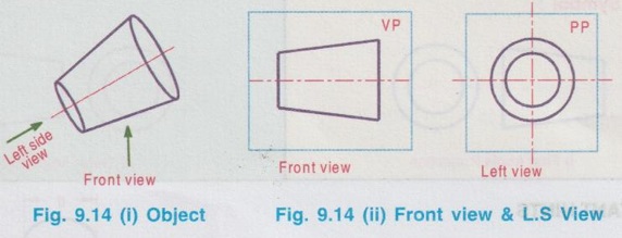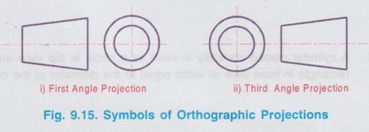 SYMBOL OF ORTHOGRAPHIC PROJECTION It is needed to indicate on a drawing sheet the method of projection (First angle (or) Third angle) in which the drawings are prepared. The standard symbol of orthographic projection is obtained as below: Consider a frustum of cone as shown in Fig. 9.14 (i). Its front view and left side view from the directions shown are given in Fig. 9.14 (ii). As we have seen earlier, in first angle projection the left side view is drawn on the right side of front view and adjacent to it. Hence the symbol of first angle projection is drawn as shown in Fig. 9.15 (i), keeping the left side view on the right side of front view. Whereas in third angle projection, left side view is drawn on the left side of front view as shown in Fig. 9.15 (ii).
