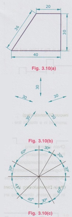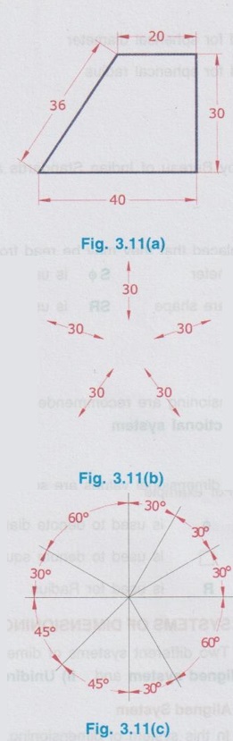 SYSTEMS OF DIMENSIONING Two different systems of dimensioning are recommended by Bureau of Indian Standards as i) Aligned system and ii) Unidirectional system In this system of dimensioning, dimensional values are so placed that they may be read from the bottom or the right-hand edges of the drawing sheet and satisfying the following conditions. i) Dimensional values should be placed parallel to the dimension line. ii) Dimensional values should be placed above the dimension line. iii) Dimensional values should not touch the dimension line. iv) Dimensional values should be placed at the middle of the dimension line. Linear dimensioning drawn in aligned system is shown in Fig. 3.10(a). Oblique dimensioning and angular dimensioning in aligned system of dimensioning are shown in Fig. 3.10(b) and 3.10(c) respectively. In this system of dimensioning, dimensional values are so placed that they may be read from the bottom edge of the drawing sheet and satisfying the following conditions. i) Dimensional values for horizontal lines should be placed at the middle of the horizontal dimension lines with interrupting the dimension line. ii) Dimensional values for non-horizontal lines (Vertical and Oblique) should be placed at the middle by interrupting the dimension line so that it can be read from the bottom edge of the drawing sheet Dimensional values in linear dimensioning, obligue dimensioning and angular dimensioning in Unidirectional system of dimensioning are shown in Fig. 3.11(a), (b) and (c) respectively. Note : In a drawing only one system either Aligned system (or) Unidirectional system to be followed. Both the system should not be used in any drawing.1. Aligned System