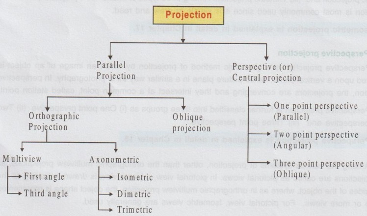 SYSTEMS OF PROJECTION The systems of projection are classified based on the direction in which the rays of sight are taken to the picture plane (drawing sheet). Based on that a projection is mainly classified into two types (i) Parallel projection and (ii) Perspective (or Central projection). Parallel projection and perspective projection are further classified as detailed below: If the rays of sight (projectors) are parallel, the projection obtained is known as parallel projection. Parallel projection is further classified into two types (i) Orthographic projection and (ii) Oblique projection. In orthographic projection, projectors are parallel to each other and perpendicular to the picture plane, where as in oblique projection, the projectors are parallel to each other but make an angle, other than 90° to the picture plane. Orthographic projection is further classified into (i) Multiview projection and (ii) Axonometric projection. Multiview Projection In multiview orthographic projection the exact shape of an object is represented by two or more separate views projected on planes that are usually perpendicular to each other. Each view shows the shape of the object for a particular view direction and these views altogether describe the object completely. Hence this method of projection is most widely used in preparing engineering drawings. Multiview projections are classified into two groups as (i) First angle projection and (ii) Third angle projection. Multiview orthographic projection is explained in detail in Chapter 9. Axonometric Projection A single pictorial view which is obtained by viewing an object after turning it to get a view of its three faces simultaneously is called as Axonometric projection. Axonometric projection is a pictorial orthographic projection in which the image of an object is projected only on one picture plane. Axonometric projection is further classified into three groups as (i) Isometric projection, (ii) Dimetric projection and (iii) Trimetric projection. Among three types of Axonometric projection, Isometric projection is most commonly used since it is simple to draw and read. Isometric projection is explained in detail in Chapter 17. Perspective projection is a geometric method of projection by which an image of an object is projected upon a vertical plane, called picture plane in a similar way as in photography. In perspective projection, the projectors are converging and they intersect at a common point, called station point. Perspective projection is further classified into three groups as (i) One point perspective (ii) Two point perspective and (iii) Three point perspective. Perspective projection is explained in detail in Chapter 18. Among the various systems of projection, other than the orthographic multiview projections, all the projections are called as pictorial views. In pictorial view, a single view is drawn indicating all the three sides of the object, where as in orthographic multiview projection, the object shape is represented by two or more views. For pictorial view, Isometric views are generally used.1. Parallel projection