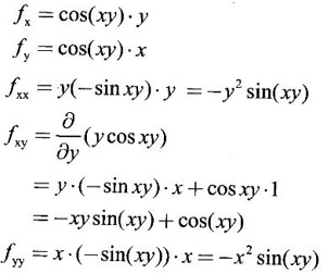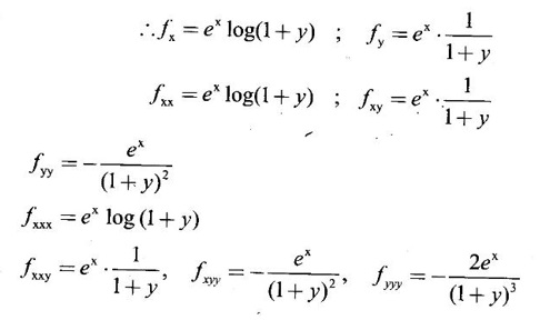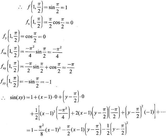 TAYLOR'S EXPANSION FOR FUNCTION OF TWO VARIABLES The Taylor's series expansion of a single variable function f(x) in a neighbourhood of a point a is which is an infinite power series in h. Maclaurin's series is These ideas are extended to a function f(x, y) of two independent variables x, y. We state the theorem. Let f(x, y) be a function of two independent variables x, y defined in a region R of the xy-plane and let (a, b) be a point in R. Suppose f(x, y) has all its partial derivatives in a neighbourhood of (a, b) then 1. Put x = a + h, y = b + k, then h = x - a, k = y - b ⸫ the Taylor's series can be written as This series is known as the Taylor's expansion of f(x, y) in the neighbourhood of (a, b) or about the point (a, b). 2. Putting a = 0, b = 0 we get the expansion of f(x, y) in the neighbourhood of (0, 0) This is called Maclaurin's series for f(x, y) in powers of x and y. Note Taylor's formula gives polynomial approximation to a function of two variables about a given point. Example 1 Expand Solution We know the expression of f(x, y) about the point (a, b) as Taylor's series is Here (a, b) = (1, 1) Example 2 Expand sin (xy) in powers of (x - 1) and Solution We know Taylor's expansion about the point (a, b) is we have f(x, y) = sin(xy) At the point (1, π/2) Example 3 Expand ex cos y near the point (1, π/4) by Taylor's series as far as quadratic terms. Solution We know Taylor's series about the point (a, b) is Example 4 Expand ex loge (1 + y) in powers of x and y upto terms of third degree. Solution Required the expansion in powers of x and y and so Maclaurin's series is to be used. We know f(x, y) = ƒ(0,0) + [x ƒx (0, 0) + y ƒy(0, 0)] Given f(x, y) = ex log (1 + y) At the point (0, 0) Example 5 Expand x2 y + 3y - 2 in powers of x - 1 and y + 2 using Taylor's theorem. Solution We know Here (a, b) = (1, −2) Note Since the given function is 3rd degree in x, y, the expansion terminates. Example 6 If f(x, y) = tan-1(xy) compute an approximate value of f(0.9, -1.2) Solution We shall use Taylor's series to find the approximate value. The point (0.9, −1.2) is close to the point (1, −1). So we shall find the Taylor's series about (1, -1). Here (a, b) = (1, −1) Put x =0.9, y = -1.2 Note We have approximated tan-1 xy by a second degree polynomial in x and y. Using this polynomial we have found the approximate value of f(0.9, -1.2) = -0.8229 But by direct computation f(0.9, −1.2) = tan-1(−1.08) = tan-1 1.08 = -0.8238 correctly upto 4 decimal places. The error is only 0.0009, which is negligible. Example 7 Find the Taylor series expansion of ex sin y at the point Solution Let f(x, y) = ex sin y We know Taylor series expansion of f(x, y) about (a, b) is Example 8 Expand ex cos y in powers of x and y at (0, 0) upto third degree term, by Taylor's theorem. Solution Let f(x, y) = ex cos y We know that Taylor's series about (a, b) is Here (a, b) = (0, 0) Taylor's series about (0, 0) is Example 9 Expand exy in powers of (x − 1) and (y - 1) upto third degree terms, by Taylor's series. Solution Let f(x, y) = exy The Taylor's series for f(x, y) about (a, b) is Here (a, b) = (1, 1) ⸫ the Taylor's series expansion for exy about (1, 1) is Example 10 Obtain the Taylor series of x3 + y3 + xy2 in powers of (x − 1) (y − 2) Solution Let f(x, y) = x3 + y3 + xy2 The Taylor series about (a, b) is Hence (a, b) = (1, 2) ⸫ Taylor's series is Example 11 Expand ex sin(y) in powers of x and y up the third degree terms. Solution Let f(x, y) = ex sin y We know the Taylor's series about (0, 0) is Here the point is (0, 0) We have ⸫ the Taylor's series isTheorem 3.4.1 Taylor's theorem