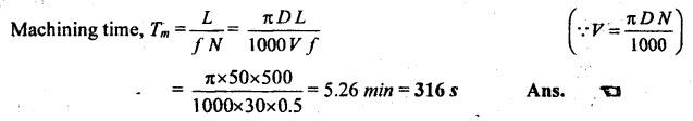 TWO MARK QUESTIONS AND ANSWERS 1. What is a lathe? Lathe is a machine which removes the metal from a piece of work to the required shape and size. 2. Write the specifications of a typical lathe. (i) The length of bed (ii) Maximum distance between dead and live centres (iii) Type of bed i.e. straight, semi gap or gap type (iv) The height of centres from the bed (v) Swing over the bed (vi) Swing over the cross-slide (vii) Width of the bed (viii) Spindle bore (ix) Spindle speed (x) HP of main motor and rpm (xi) Number of spindle speeds (xii) Spindle nose diameter (xiii) Feeds (xiv) Floor space required. 3. What is meant by "swing of the lathe"? The largest diameter of work that will revolve without touching the bed and twice the height of the center measured from the bed of the lathe. It can also be defined as the swing of a lathe which describes the maximum diameter of an object that will clear off the bed of the machine when gripped in the chuck. 4. What is swing diameter? The largest diameter of work that will revolve without touching the bed and twice the height of the center measured from the bed of the lathe. 5. Write down any four operations performed on a center lathe. (i) Chamfering (ii) Knurling (iii) Filing (iv) Forming (v) Grooving 6. List out the various types of lathe. 1. Speed Lathe (a) Wood working lathe (b) Metal spinning lathe (c) Metal turning lathe (d) Polishing lathe. 2. Engine lathe (a) Step cone pulley drive lathe (b) Geared lathe (c) Variable speed lathe. 3. Bench lathe 4. Tool room lathe 5. Semiautomatic lathe (a) Capstan lathe (b) Turret lathe 6. Automatic lathe 7. Special purpose lathe (a) Crankshaft lathe (b) Wheel lathe (c) Duplicating lathe 8. Copying lathe. 7. What are the principle parts of a lathe? (a) Bed (b) Headstock (c) Tailstock (d) Carriage (e) Cross-slide (f) Tool post. 8. Explain following parts of a lathe. (a) Lathe bed: Bed is the base of the machine. It carries a headstock on its left end and tailstock on its right end. The carriage is mounted on middle of the bed. (b) Carriage: The carriage is a moving part which slides over the guide ways between headstock and the tailstock. 9. What are the main requisites of a lathe bed? The lathe bed should have accurately machined surface. It should be strong enough to withstand cutting forces and vibrations during machining. 10. What are the uses of headstock? 1. Headstock carries a hollow spindle with nose to hold the workpiece. 2. It is used to mount the driving and speed changing mechanisms. 11. What are the types of headstock? 1) Back geared type 2) All geared type. 12. What is the main difference between live centre and dead centre? (a) Live centre drives and rotates along with the workpiece. (b) Dead centre just supports the other end of the workpiece. 13. Write down the names of any four lathe Accessories. Lathe centres, catch plates, carriers, chucks, mandrels, rests and other special attachments such as milling, drilling and taper turning attachments. 14. How the taper is formed on the workpiece by using tailstock? The upper body of tailstock can be tilted towards or away from zero angle. In tailstock set over method, the workpiece is held between the live centre and dead centre. Now, the tailstock is moved crosswise i.e., perpendicular to the lathe axis by turning the set over screw. This process is called tailstock set over. Hence, the job is inclined to the required angle. The angle at which the axis of rotation of the workpiece is shifted is equal to the half angle of taper. 15. State the various parts mounted on the carriage. (a) Saddle (b) Compound rest (c) Cross slide (d) Tool post. 16. What are the functions of feed rod and lead screw? Feed rod: Feed rod is used to guide the carriage in a straight line when it moves along the bed. Lead screws Lead screw is used to move the carriage while thread cutting operation is carried out. It also ensures the proper speed of work relative to the tool for thread cutting operation. 17. How are holes drilled in a center lathe? First, the dead centre of the tailstock is replaced by a drill bit. The longitudinal movement of the tailstock is locked after setting the approach of drill. Finally, the hand wheel of the tailstock is rotated for making the hole on the specimen. 18. What is a compound rest? A member or part which is mounted on the top of the cross slide having a base graduated in degrees. 19. What are the types of tool post? 1) Single screw tool post 2) Open side tool post 3) Four bolt tool post and 4) Four way tool post. 20. How the cutting tool is fixed on a single screw tool post? And how can the tool height is varied? A single screw tool is used to hold only single tool which are clamped by clamping screw. The tool height can be varied by adjusting a rocker placed on the tool post. 21. State the provision for adjusting the tool height in open-side tool post. Parallel strips packing are used to adjust the tool height. 22. Name the methods of taper turning on lathe. (a) Form tool method (b) Tailstock set over method (c) Compound rest method (d) Taper turning attachment method. 23. Why is it essential that the cutting point of the tool should be level with the spindle center while machining taper on a workpiece? The cutting point of the tool should be level with the spindle center while machining taper on a workpiece is done to avoid eccentricity in taper turning. 24. Calculate the time taken for one complete cut on a workpiece of 500 mm long and 50mm diameter. The cutting speed is 30 m/min and the feed rate is 0.5 mm/rev. Given data: D = 50 mm L = 500 mm V = 30 m/min f = 0.5 mm/rev Solution: 25. What is an apron? Apron is an integral part of several gears, levers and clutches which are mounted with the saddle for moving the carriage along with lead screw while thread cutting. 26. What are the various thread cutting methods? 1. Reversing the machine 2. Marking the lathe parts 3. Using a chasing dial or thread indicator 4. Using thread chaser. 27. W