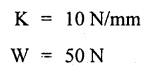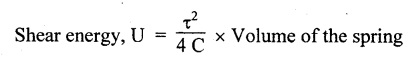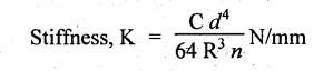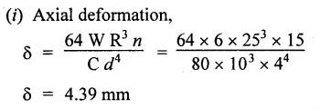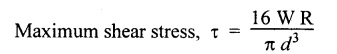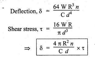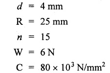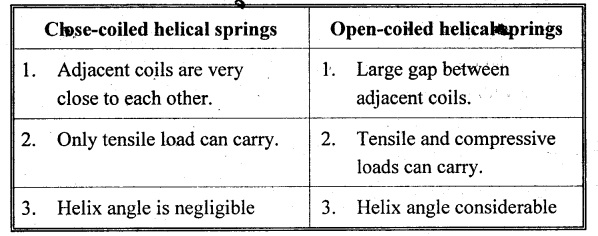 vertical load W. 16. What are the uses of closed coiled helical spring? Railway wagons, cycle seating, pistols, brakes etc. 17. Write the equation for the deflection of an open coiled helical spring subjected to an axial load, W. 18. What is meant by spring constant or spring index? Spring constant is the ratio of mean diameter of the spring to the diameter of the wire. 1. Derive the expression for deflection, shear stress and strain energy for close coiled helical spring when it is subjected to axial load W. 2. Derive the expression for equivalent stiffness when two springs are connected in (i) Series and (ii) Parallel. 3. Derive the expression for strain energy stored in the closed coiled helical spring when it is subjected to axial twisting couple. 4. Derive an expression for axial deflection and angular rotation of open coiled helical spring subjected to axial load. 5. Derive an expression for axial rotation and axial deflection of open coiled helical spring subjected to twisting couple. 6. What are the stresses induced in the open coiled helical spring wire when it is subjected to axial load and axial torque? Explain. 1. A closed coiled helical spring is made from steel wire 0.5 m diameter and there are ten free coils having a mean diameter of 6 m. The spring is subjected to an axial load of 40 N. Determine the maximum intensity of shear stress in the steel, and the total deflection under the above load. What is the stiffness in N per m of deflection? C = 24 × 106 N/m2. 2. A composite spring has two closed coiled helical springs connected in series, each spring has 12 coils of a mean diameter of 2.5 cm. Find the wire diameter in one if the other is. 2.5 mm, and the stiffness of the composite spring is 4 N/m. Estimate the greatest load that can be carried by the composite spring and the corresponding extension of a maximum shearing stress is 12 tons/sq.m. Take C = 11.5 × 106 N/m2. 3. A helical closed coiled spring has 8 coils of 2 cm diameter wire and mean radius of 5 cm. The axial length of the unloaded spring is 10 cm. If C = 12 × 106 N/cm2, calculate the extension of the spring under an axial load of 200 N. 4. A closely coiled helical spring is to be designed to have a mean coil diameter of 100 mm and deflect 15 cm under an axial load of 1250 N without the shear stress exceeding 25 tons/cm2. If wires are available in the following diameters 9.5 mm, 12.7 mm, 16 mm and 1.9 cm. Find the most suitable diameter, the number of coils required and the maximum shear stress developed. Take modulus of rigidity is 20 × 106 N/cm2. 5. A closed coiled helical spring of circular section has a mean coil diameter of 7.62 cm, when subjected to an axial torque of 5400 N-cm. There is an angular rotation of 90° and when an axial load of 900 N is applied, the spring extends 12.5 cm. Find the Poisson's ratio. 6. (a) A closed coiled helical spring made from 25.4 mm diameter steel has 20 coils of mean diameter 254 mm. Find the elongation under an axial pull of 1000 N. Take C = 12 × 106 N/mm2. (b) A truck weighing 3 tons travels at 4000 km/hr. Find how many of the above springs will be required to store energy of motion if the compression of the spring is limited to 205 mm. 7. An open coiled helical spring is made out of 20 mm diameter steel rod, the coils having 12 complete turns and a mean diameter of 200 mm, the angle of helix being 15°. Calculate the deflection under an axial load of 600 N and maximum intensities of direct and shear stresses induced in the section of the wire. If the axial load of 600 N is replaced by an axial torque of 16 N-m, calculate the angle of rotation about the axis of the coil and the axial deflection. Take C = 1.65 × 105 N/mm2 and E = 2.1 × 105 N/mm2. 8. An open coiled helical spring of 85 mm mean diameter is made of steel of 7 mm diameter. Calculate the number of turns required in the spring to give a deflection of 25 mm for an axial load of 400 N if the angle of helix is 18°. Calculate also the rotation of one end of the spring relative to the other if it is subjected to an axial couple of 15 N-m. Take E = 200 Gpa and G = 81 Gpa.REVIEW QUESTIONS