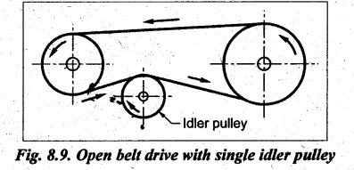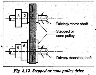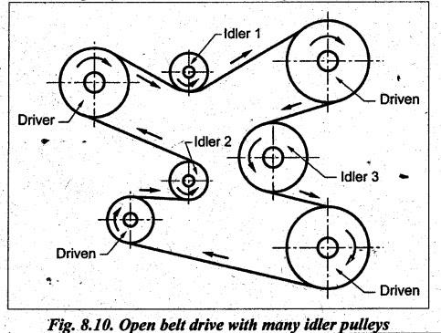 TYPES OF BELT DRIVES • The belt drives can be broadly classified as shown in Fig.8.5. • In parallel drives, the axes of rotation of the driving and driven pulleys are parallel. On the other hand, in angular drives, the axes of rotation of the driving and driven pulleys are either at right angles or intersecting when produced. • Depending on the requirement, belts can be arranged in different ways. The different types of belt arrangement and their applications are tabulated, as shown in Table 8.3. Table 8.3. Types of flat belt drives and their applications 1. Open Belt Drive • The open belt drive is used with shafts arranged parallel and rotating in same direction, as shown in Fig.8.6. • Driver and driven: One of the two connected pulleys (usually coupled with motor shaft) that drives the belt is called the driver pulley or the driver. The other pulley, which is driven by the driver, is called the driven pulley or the driven or the follower. • It may be noted that unlike in gear drives, it is not necessary for the driver pulley to be smaller than driven pulley. This is because the belt drive can be used either as a speed reducer or for increasing the speed. • Right and slack sides: In Fig.8.6(a), driver pulley pulls the belt from one side (lower side CD) and delivers it to other side (upper side AB). So tension in the pulled side (i.e., side CD) will be more than the other side (ie., side AB). Because of more tension on side CD, the side CD is known as tight side whereas the side AB (because of lesser tension) is known as slack side. • In Fig.8.6(b), it may be noted that the driver pulley is smaller than the driven pulley. Also the pulled side (i.e., side AB) of the belt is the tight side and the right side of the is the slack side. 2. Crossed (or Twisted) Belt Drive • The crossed or twist belt drive is used with shafts arranged parallel and rotating in the opposite direction, as shown in Fig.8.7. • Like in open belt drive, in Fig.8.7, driver pulley pulls the belt from one side (ie., side CD) and delivers it to other side (i.e., side AB). So tension in the pulled side (side CD) will be more than the other side (side AB). The side CD of the belt is the tight side whereas the side AB of the belt (because of lesser tension) is the slack side. 3. Compound Belt Drive • A compound belt drive is used when power is transmitted from one shaft to another through a number of pulleys, as shown in Fig.8.8. • Usually the compound belt drive is used to connect shafts with large centre distance. • In Fig.8.8, the pulleys 2 and 3 are known as intermediate shafts or countershaft pulleys. Countershaft pulleys are used where very high speed reduction is required. 4. Open Belt Drive with Idler Pulleys (a) Open belt drive with single idler pulley • A belt drive with an idler pulley is used with shafts arranged parallet and when an open belt drive cannot be used due to small angle of contact on the smaller pulley, as shown in Fig.8.9. • On account of constant use of belt, it gets permanently stretched. This reduces the initial tension in the belt and increases the slip between the belt and pulley. In that case idler pulley is used to maintain the tension in the belt. • The idler pulley, also known as jockey pulley, is a tensioner that helps provide the right level of tension on the belt and ensure correct operation. • An idler pulley is also a guide pulley on long stretches of belts that helps them from coming off the main pulley. (b) Open belt drive with many idler pulleys • A belt drive with many idler pulleys is used when it is desired to transmit motion from one shaft to several parallel shafts, as shown in Fig.8.10. 6. Quarter Twist (or Quarter Turn) Drive • The quarter turmbelt drive is used with shafts arranged at right angles and rotating in one definite direction, as shown in Fig.8.11. • In this drive, the axes of the driving and driven shafts are non-intersecting but at right angle to each other. • In the drive shown in Fig.8.11, the driving pulley must rotate in anticlockwise direction. If the direction is reversed the belt will run off the pulleys. 9. Stepped (or Cone) Pulley Drive • A stepped or cone pulley drive is used for changing the speed of the driven shaft while the main or driving shafts runs at constant speed, as shown in Fig.8.12. • Stepped pulleys are used for varying the speed of the driven/machine shaft. The speed of the driven shaft can be varied gradually by shifting the belt from one part of the steps to the other. • In Fig.8.12, two cone pulleys are used. One cone pulley is keyed to driving shaft and the second cone pulley is keyed to the driven shaft. When the belt is on steps (1) and (4), the speed of driven shaft is lowest. To increase the speed of driven shaft, the belt is shifted to steps (2) and (5). For further increase in speed of driven shaft, belt is shifted to steps (3) and (6). 10. Fast and Loose Pulley Drive • A fast and loose pulley drive is used when the driven or machine shaft is to be started or stopped whenever desired without interfering with the driving shaft, as shown in Fig.8.13. • In a factory or workshop where several machines are driven from a single driving shaft. The shaft of each machine has two pulleys: fast and loose pulleys. The fast pulley is keyed with machine shaft whereas the loose pulley has a bush in its hole and is free to rotate on the machine shaft. The belt actuator/shifter is used to push the belt between loose pulley and fast pulley, as per the requirement. • When the belt is shifted to fast pulley, the power is transmitted to the machine. But when the machine is to be stopped without stoppin the other machines, the belt is shifted to its loose pulley with the help of belt actuator. In that position, belt will rotate the loose pulley but the machine shaft will not rotate because the loose pulley is free to rotate on it. Note Crowning of pulley: The rim of the pulley is given camber (i.e