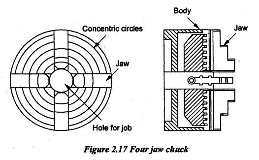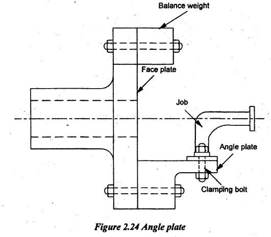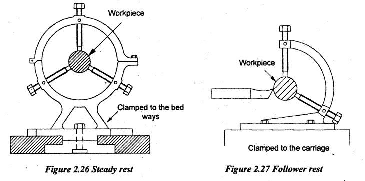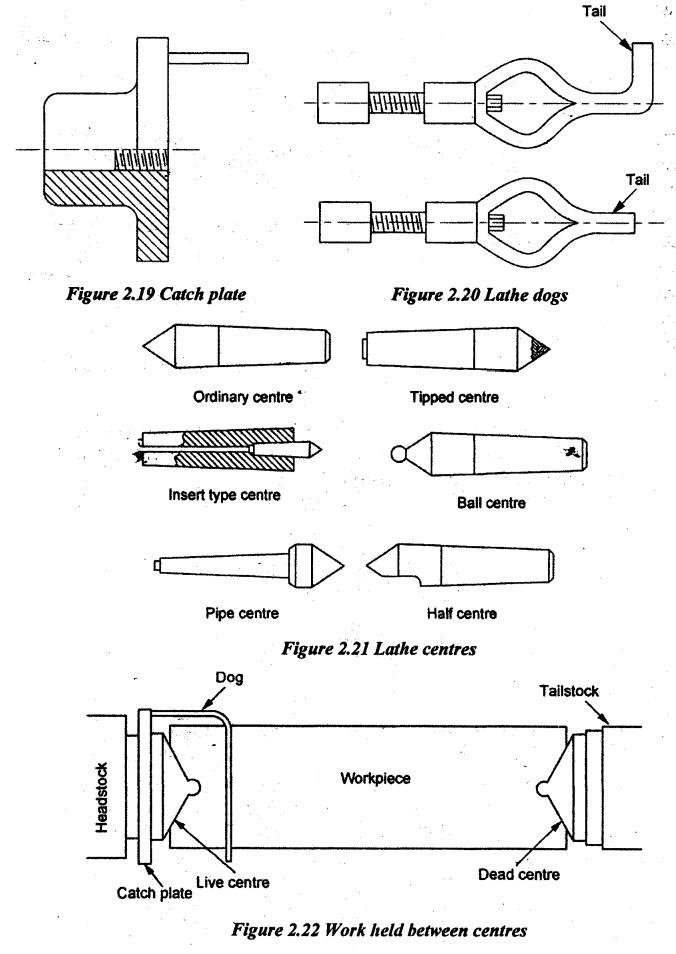 WORK HOLDING DEVICES Some of the standard work holding devices used to hold the work in a lathe are given below. (i) Chucks (ii) Centres (iii) Faceplate (iv) Angle plate (v) Mandrels (vi) Steady and follower rest. Chucks are used to hold the workpieces of small length (L < 4D) and large diameters. It can also hold the irregular shape workpieces. Workpieces which cannot be mounted between centres are mounted in chucks. A chuck is attached to the headstock spindle of the lathe. The work is clamped between jaws of the chuck and jaws are tightened. The right end of the workpiece can be supported by the dead centre if needed. There are three types of chucks. (i) Three jaw chuck or self-centering chuck (ii) Four jaw chuck or Independent chuck (iii) Magnetic chuck. 1. Three jaw or self-centering chuck: As the name implies, it has three jaws. When the chuck key is turned, all jaws will move for equal distance in the radial direction. The chuck has an internal mechanism to simultaneously move three jaws. Hence, the work can automatically be centered and quickly. It consists of a circular disc. The disc has a spiral scroll of the front and bevel teeth at its back. Three bevel pinions are fitted with the bevel teeth of the disc. By rotating any one of these bevel pinions, the disc will rotate. Hence, jaws meshed with spiral scroll move. This chuck is used for holding round, hexagonal and other regular shaped workpiece. 2. Four jaw or Independent Chuck: It has four jaws. Each jaw can independently be moved. These jaws have slots at the backside to mesh with screws. These screws can be screwed in or out of the body. The screws have a square hole at the top to receive chuck key. When the chuck key is turned in the slot, the particular jaw will only be moved. Therefore, the irregular job can be held in this chuck. These jaws can be reversed for holding large hollow workpieces. Concentric circles are inscribed on the face of the chuck for quick centering of workpieces. 3. Magnetic chuck: Thin jobs can be held by means of a magnetic chuck. The chuck gets magnetic power from an electromagnet. Due to magnetic power, the job is held in position on the flat face. The main disadvantage is that the magnetic material can only be held on this chuck. Generally, the long shaft can be held between centres. Catch plate and dog carriers are used to hold the job between centres. The catch plate is in the form of a circular disc as shown in Figure 2.19 and it is screwed on the spindle nose. The various dog carriers are shown in Figure 2.20. These dog carriers are clamped to the job by a screw. The tail of the dog carrier is attached to the catch plate. The live centre is inserted in the headstock spindle. The tailstock carries a dead centre. Small holes are drilled on both ends of the job and they are supported by centres. The various lathe centres are shown in Figure 2.21. When the spindle rotates, the workpiece will rotate through the catch plate and carrier arrangement as shown in Figure 2.22. The live centre will revolve the workpiece and the dead centre will support the right end of the work. The faceplate is a circular cast iron disc and has four T-slots and a number of plain radial slots as shown in Figure 2.23. These slots are used for holding the work by bolts and clamps. It is highly efficient for holding the asymmetrical work or work of complex and irregular shapes which are inconvenient to clamp by other means. When the spindle rotates, the faceplate will also rotate. So, the work will rotate. Angle plate is a cast iron block and it has two accurately machined faces at right angle to each other. It has holes and slots on both faces so that its one face may be clamped on the faceplate and the workpiece is mounted on the other face. When the spindle rotates, the faceplate will also rotate. So, the angle plate and job also rotate. Usually, the counterweights are fitted to balance the weight of the job. The job is eccentrically fitted or fitted in angle plate. The angle plate used for holding elbow piece is shown in Figure 2.24. Mandrels are used for holding hollow workpieces. The work revolves with the mandrel which is mounted between two centres. There are different types of mandrels used for various types of jobs. They are shown in Figure 2.25. The outside diameter of mandrel should be equal to the inside diameter of the job. The rest is a device which supports long workpieces i.e. L/D > 10 or 12 when machined between centres or held by a chuck. It is placed in between headstock and tailstock. It prevents the vibration and bending of the workpiece. There are two types of rests. (a) Steady rest (b) Follower rest. 1. Steady rest: These types of rests are fixed on bed ways of the lathe by clamping bolts. There is a cast iron base which is used to clamp the rest on the bed. The upper portion of the rest is hinged at one end. It is used to remove the job without disturbing the steady rest. The workpiece is supported by three jaws arranged as shown in Figure 2.26. The jaws can separately be adjusted in the radial direction. For the wark to be turned at high velocity, the jaws have built up balls or roller bearings to support it. After setting the jaws over the workpiece, the rest is clamped to the lathe bed to the required position. Since the carriage cannot pass over it the job is turned in two stages by reversing one end after half machining the length. For longer workpieces, two or more steady rests can be used. 2. Follower rest: The rest is mounted on the saddle and it moves together with the tool. It has a C type casting and two adjustable jaws to support the workpiece shown in Figure 2.27. The jaws always follow the tool. Therefore, it gives a continuous support to the workpiece.1. Chucks