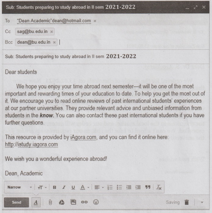 Topic – 1 WRITING EMAILS / MESSAGES INTRODUCTION Emails are widely used not only for academic and business communication but also for personal exchanges because of their speed and convenience. The inbuilt format of an email letter includes the following lines that the sender must fill in before sending it off. To: This is for the email address of the recipient; more than one address can be written, separated by commas. Cc (carbon copy, or copy to): This is for a list of addresses to which you want to send copies of your message. Bcc (blind carbon copy): Recipients' addresses typed here will not be seen by other recipients. Use this if you do not want the person /people to whom you are writing to know who you are keeping informed. It also protects the privacy of people who may not want to reveal their email address. In personal emails we usually do not use this field. Subject: This tells the recipient what the email is about. In a personal mail you may just write 'Hello' or something personal like 'Remember me?? The subject line must be clear and specific so that the recipient gets an idea of its content even before reading your letter. The subject line also helps recipients' later search for and find particular messages. Attachments: These are files which go with your message that the recipient will download to read or see. Note that the email address of the sender and the date (and time) appear automatically when an email sent, but in many formal emails, they are also included in the letter. Here are some important points to remember when writing email messages. ✓ The tone you use should be appropriate to the relation you have with the recipient of your message. When you write to close friends, using informal or even casual language is acceptable. But when you are writing a formal email letter on a work-related matter, use language that is appropriate for its subject. ✓ Make the message easy to read. If there are many points in your email letter, say so at the beginning of your message. Otherwise, the reader may see something that interests him/ her halfway down the message and hit the reply button to write back to you. ✓ Avoid writing long messages. Many people get larger numbers of email messages and will try to rush through them. They may pass on to the next message if yours is too long. ✓ Send attachments only if necessary. Attachments that have graphics or photographs can take a long time to download. They can carry viruses or be incompatible with the software of the recipients computer. Be considerate of the recipient's circumstances (access and affordability of bandwidth). ✓ Typing the whole message in capital letters is considered to be a rude act, known as “flaming' and is the equivalent of shouting; it will offend the recipient. ✓ Even though a personal email can only be seen by the recipient, be aware that messages can easily be shared or forwarded. Be cautious about what you write and think twice whether you want to put your thoughts down in writing, especially when you are annoyed. Do not use email messages to attack someone or to vent your anger. ✓ Do not write anything in your message that is illegal or unethical. Though email affords privacy to users, remember that anything that you send can be retrieved by hackers, your employers, government investigating agencies and even criminals. Look at the samples e-mail below, Sample Email message: 1 Sample Email message: 2 Sample Email message : 3 I. Write the following e-mails, inventing suitable Ids. 1. Imagine yourself to be the instructor of a course in which 75 students have registered. Draft an e-mail to be sent to all these students asking them to select a topic of their choice and prepare for a professional presentation of 10 minutes duration. 2. As the Sales Manager of a company, draft a reply which has to be sent in the form of an e-mail to three customers who have complained about your product. Invent necessary details. 3. Assume that you are Niren Bhattacharya, a student doing B.Tech in Mechanical Engineering from IIT, Delhi. Write an e-mail message to Kabir Sahini, the Personal Manager of Alpha Industries requesting him to allow you to do summer training at the Gurgaon Plant of the company. Tell him that you need to do a two weeks training at some company as part of your academic assignments. 4. Suppose you want to take an education loan from Citi Bank. Write an e-mail for the Credit Manager of Citi Bank, Mumbai requesting him to send you details regarding educational loans by Citi Bank. 5. Assume that you have to write an e-mail to Librarian in-charge of the central library of your university requesting him to send you information regarding new arrivals in the library through e-mail. 6. You are Sunil Mehta, Purchase Officer, Central Mining Research Institute, Nagpur. Write an e-mail to the Sales Manager of HCL Limited, Kolkata office. You want fifty HCL Desktop computers at the quoted price of Rs. 21,327/- each. Request the Sales Manager to send details regarding payment system, freight and handling charges, and the delivery time. 7. Assume that you are the Managing Director of a company dealing with electronic equipment. Inform all your employees about the new community hall which the company is going to inaugurate next week. Highlight the important features of both the hall and the inauguration. 8. As the Personnel Manager of a multinational firm, draft an e-mail to be sent to those candidates who were not selected in the interview conducted few days before. Take care not to be courteous and sympathetic while conveying the negative message. 9. Write e-mail to your friend condoling him on the death of his grandfather. 10. Write e-mail to your elder brother in the states requesting him to send a few latest books on computer, which are not available in our country.Practice Exercises